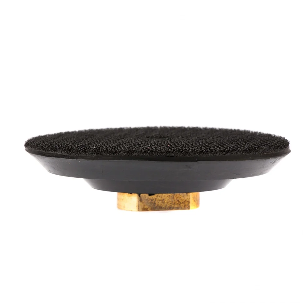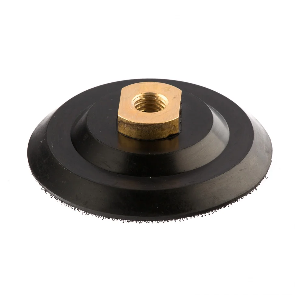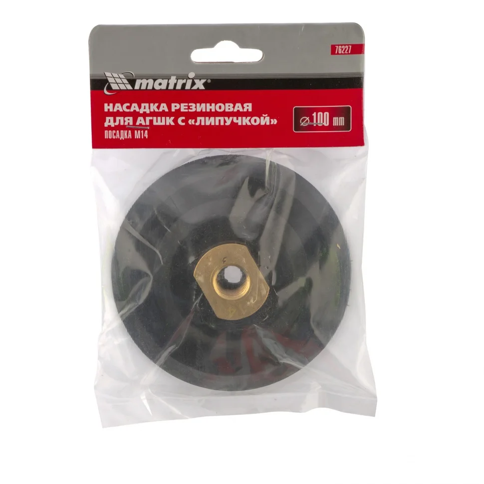 Резиновая насадка для АГШК Matrix 76227 диаметром 100 мм, с липучкой и посадочной резьбой М14, — опора для крепления алмазных гибких шлифовальных кругов, или «черепашек». Предназначена для установки на углошлифовальные машины, работающие со скоростью до 12500 об/мин. Изготовлена из прочной резины, обеспечивающей хороший контакт шлифкруга с обрабатываемой поверхностью. Насадка применяется при шлифовке и полировке каменных, гранитных, мраморных и керамогранитных поверхностей.ПреимуществаУстановка и замена АГШК на «липучке» занимает несколько секунд, т.к. контактная поверхность насадки представляет собой нейлоновый круг с крючками (velcro).Насадка универсальна в применении, поскольку ее можно использовать при шлифовке как с водяным охлаждением, так и без него.Опорную тарелку можно установить на дрель, если использовать переходник Matrix 76290.