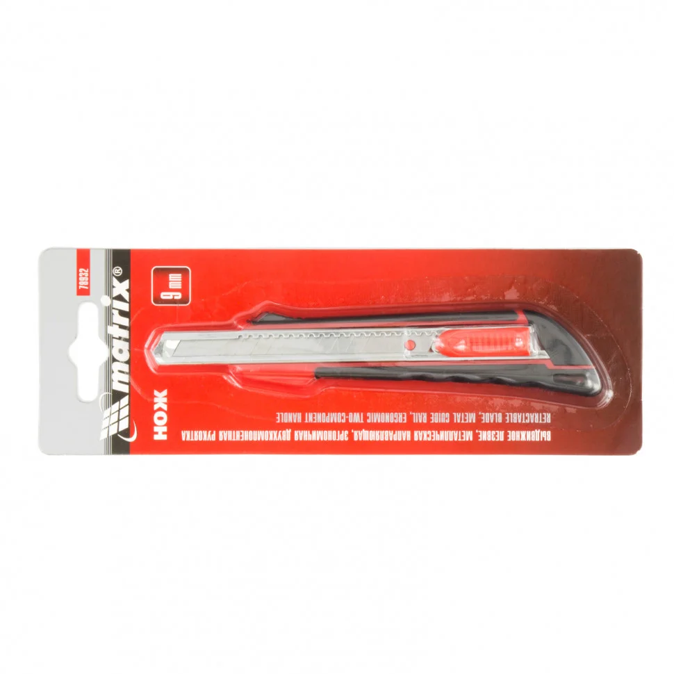 Нож Matrix 78932 с выдвижным лезвием шириной 9 мм, металлической направляющей и эргономичной двухкомпонентной рукояткой пригодится при выполнении ремонтных и строительных работ в мастерской и в быту. Он легко режет бумагу, картон, кожу, обои и другие материалы. Выдвижная конструкция позволяет с удобством эксплуатировать и безопасно перевозить нож.ПреимуществаПрочность и надежность лезвия обеспечивает сталь 60, из которой оно изготовлено.При необходимости лезвие легко меняется через хвостовую часть инструмента.Металлическая направляющая защищают корпус от повреждений даже при интенсивном использовании.На лезвие нанесены риски, поэтому при затуплении кромки достаточно отломать сегмент и продолжить использование ножа.