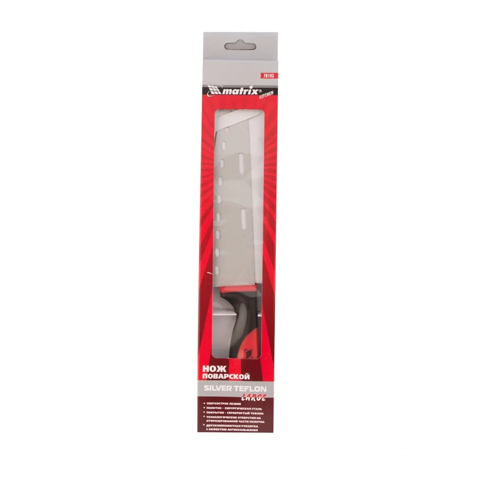 Поварской нож Matrix KITCHEN «Silver Teflon» large 79143, 200 мм, с тефлоновым покрытием полотна и двухкомпонентной рукояткой, применяется для нарезания всех видов продуктов — сыра, колбасы, ветчины и других закусок, а также мяса, птицы, рыбы, овощей, фруктов и зелени. На полотне имеются технологические отверстия, благодаря которым продукты не прилипают к клинку. Нож пригодится на каждой кухне.ПреимуществаКлинок из хирургической нержавеющей стали обладает высоким рабочим ресурсом.Высокопрочное и износостойкое серебристое тефлоновое покрытие характеризуется минимальным коэффициентом трения, что исключает налипание кусочков продуктов на полотно.Эргономичная рукоятка с антискользящим покрытием делает облегчает процесс нарезания продуктов.Защитный протектор препятствует соскальзыванию пальцев на лезвие, обеспечивая безопасность во время работы.