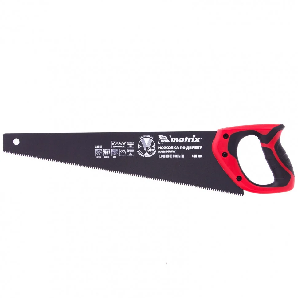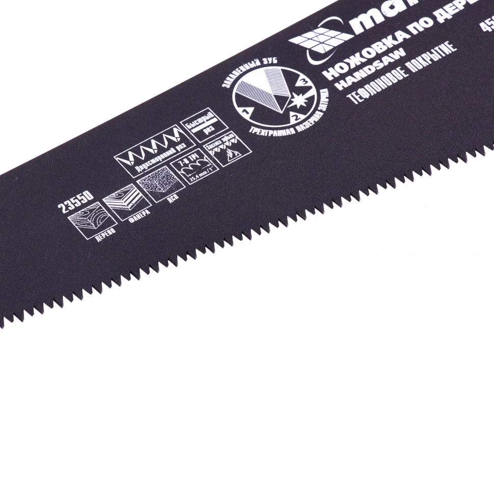 Ножовка по дереву Matrix 23550 с полотном длиной 450 мм, с калеными зубьями с шагом 7-8 TPI и 3D-заточкой, с тефлоновым покрытием полотна и 2-компонентной рукояткой, пилит древесину, фанеру и ДСП. Подходит для продольного и поперечного пиления. Имеет 7-8 зубьев на дюйм, поэтому используется для быстрой распиловки заготовок. Трехгранная заточка зубьев обеспечивает ножовке повышенную производительность. Ножовка будет полезна столярам, плотникам, а также пригодится в домашнем хозяйстве.ПреимуществаПолотно из холоднокатаной стали 65Mn обладает прочностью и устойчивостью к динамическим нагрузкам.Закаленные зубья твердостью 50-55 HRC долго держат заточку.Поверхность полотна с тефлоновым покрытием не боится коррозии.Тефлоновое покрытие улучшает антифрикционные свойства полотна, что повышает скорость распиловки.Крепление рукоятки к полотну 3 винтами обеспечивает надежность конструкции.Эргономичная двухкомпонентная рукоятка удобно лежит в руке, уменьшая усталость во время длительной работы.Инструмент, изготовленный на заводе с японским оборудованием и строгим контролем на каждом этапе производства, отличается высоким качеством.