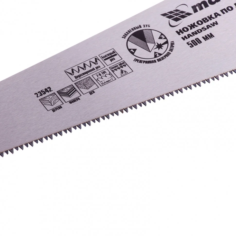 Ножовка по дереву Matrix 23542 с полотном длиной 500 мм, с калеными зубьями с 3D-заточкой и шагом 7-8 TPI, с двухкомпонентной рукояткой, используется для продольного и поперечного пиления досок, брусков, листов фанеры, ДСП. Благодаря трехгранной заточке зубьев пила характеризуется высокой производительностью. Шаг зубьев составляет 7-8 TPI, что обеспечивает быстрый и качественный рез. Ножовка пригодится в столярной мастерской, а также будет полезна в хозяйстве.ПреимуществаМеханическая прочность — полотно изготовлено из холоднокатаной пружинной стали 65Mn, устойчивой к динамическим нагрузкам.Высокий рабочий ресурс — зубья закалены и имеют твердость 50-55 HRC.Коррозионная стойкость — на полотно нанесено защитное лаковое покрытие.Комфорт во время работы — эргономичная двухкомпонентная рукоятка с резиновыми вставками имеет усовершенствованный дизайн и удобно лежит в руке, снижая нагрузку на кисть при длительном пилении.Надежность — ножовка изготовлена на японском оборудовании и прошла строгий контроль качества.