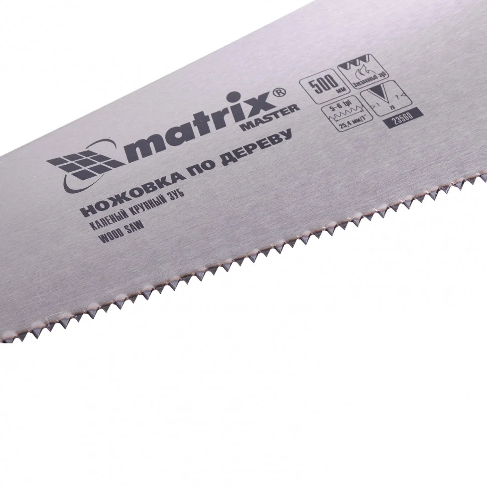 Ножовка по дереву Matrix 23560 с полотном длиной 500 мм, с крупными калеными зубьями с шагом 5-6 TPI и 2D-заточкой, с двухкомпонентной рукояткой, используется для быстрой продольной или поперечной распиловки древесины. Высокая скорость работы достигается благодаря крупным зубьям с волновой заточкой и универсальным шагом 4-5 мм. Двухгранная заточка зубьев дает возможность пилить в направлении как от себя, так и на себя, а также перетачивать режущую кромку при необходимости. Ножовка подходит для выполнения плотницких и хозяйственных работ.ПреимуществаПолотно обладает высокой механической прочностью, поскольку изготовлено из пружинной стали 65Mn.Рабочая кромка долго сохраняет режущие свойства благодаря закаленным зубьям.Инструмент устойчив к коррозии, т.к. его полотно покрыто защитным лаком.Работа с ножовкой комфортна, поскольку эргономичная рукоятка с рельефной поверхностью не скользит в руке.Высокое качество ножовки подтверждено производителем, осуществляющим постоянный технологический контроль на всех этапах производства.