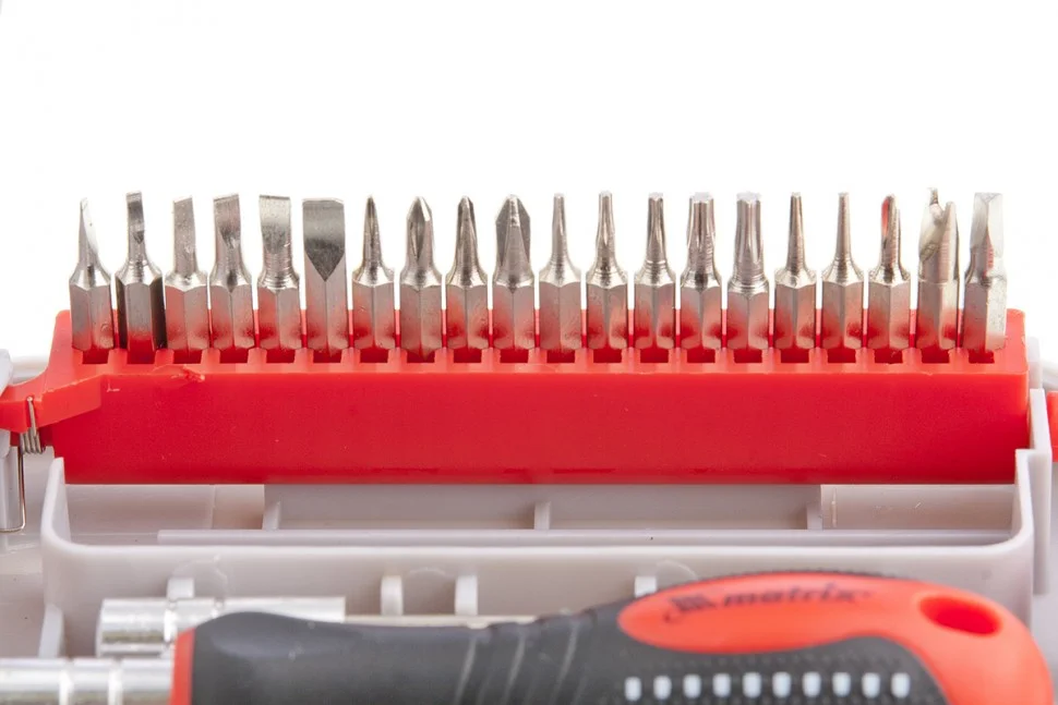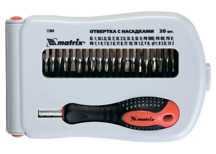 Отвертка для точных работ Matrix Fusion 11584, с насадками, — это набор из 22 предметов в пластиковом пенале, который используется для ремонта электротехники, очков, мобильных телефонов, ноутбуков и т.д. Набор пригодится профессиональным мастерам. 20 бит для точных работ и битодержатель, входящие в комплект, обеспечивают эффективное решение поставленных задач.ПреимуществаСтержень и биты выполнены из легированной стали CrV, закаленной до твердости 50-55 HRC, что придает им высокую прочность и надежность.Мощный магнит на присоединительном шестиграннике гарантирует надежность удержания бит.Намагниченный наконечник бит повышает удобство работы, позволяя одной рукой придерживать закрепляемую деталь.Трехкомпонентная рукоятка с подпальцевыми выемками и противоскользящим покрытием обеспечивает комфортную работу.Набор поставляется в кейсе с подпружиненной крышкой и поворотной плашкой для бит для удобства хранения, транспортировки и эффективной организации рабочего пространства.