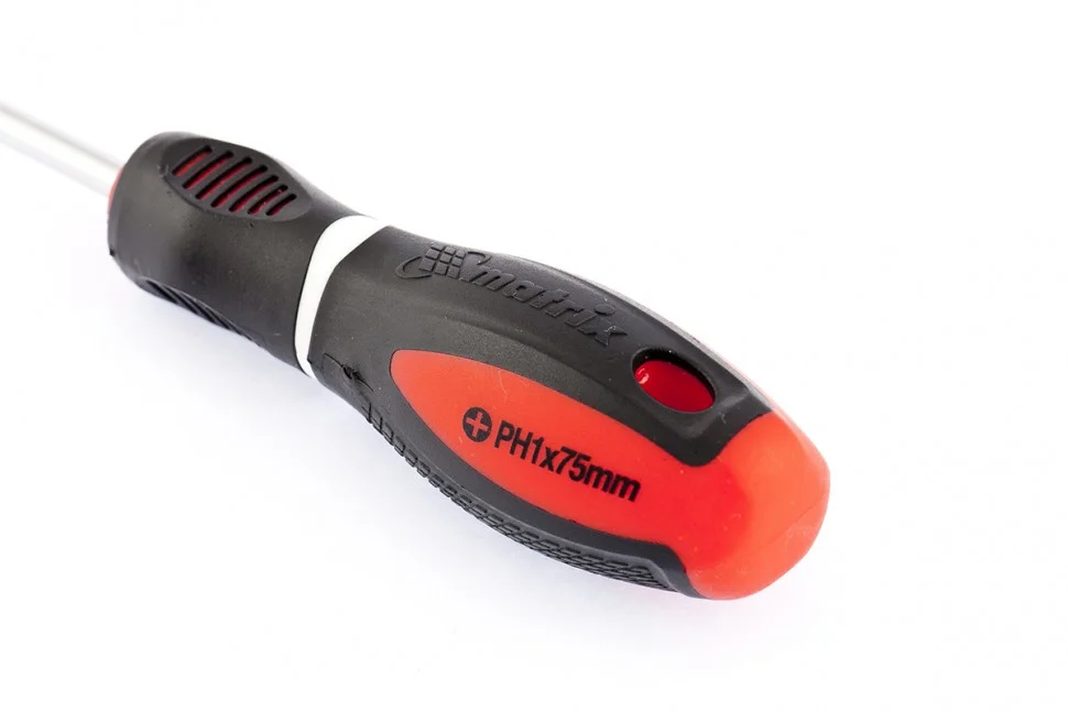 Отвертка Matrix «Era» 12054, PH1 х 75 мм, из стали CrV, с 3-х компонентной рукояткой, подходит для профессионального использования при осуществлении монтажных, ремонтных и строительных работ. С ее помощью можно выполнить монтаж/демонтаж крепежа Phillips «крест». Стержня длиной 75 мм достаточно для работ на поверхностях и в углублениях.ПреимуществаЖало и стержень выполнены из высококачественной хромованадиевой стали, это придает им прочность и долговечность.Шлиц прошел индукционную закалку до твердости 50-55 HRC, благодаря чему снижается его стирание и риск залома.Фосфатное покрытие защищает жало от коррозии и обеспечивает улучшенное сцепление с головкой крепежа.Намагниченное жало гарантирует надежное удержание крепежа и позволяет освободить одну руку во время работы.Маркировка рабочих параметров на рукоятке повышает удобство использования отвертки.Трехкомпонентная рукоятка с насечками обеспечивает надежный хват и снижает усталость в руках.