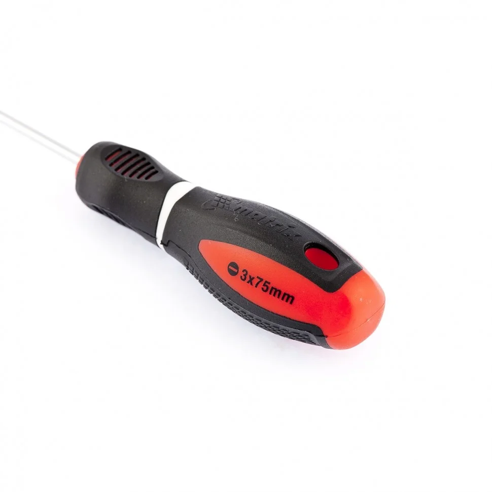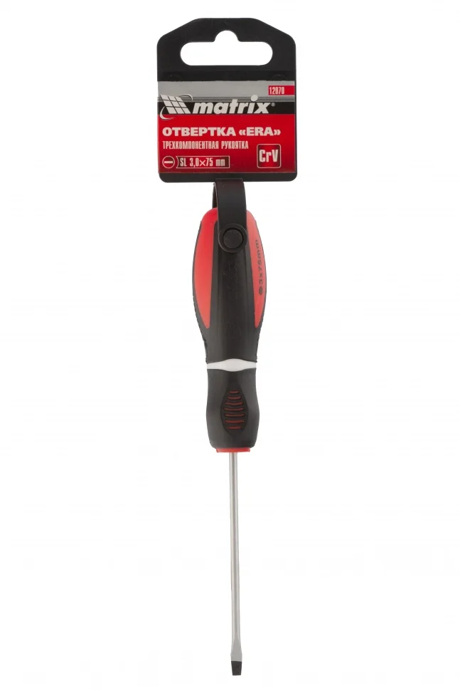 Отвертка Matrix «Era» 12070, SL3,0 х 75 мм, из стали CrV, с 3-х компонентной рукояткой, позволяет осуществлять монтаж/демонтаж крепежа Slotted «минус». С ней можно произвести монтажные, ремонтные и строительные работы. А благодаря стержню длиной 75 мм можно достать до крепежа в углублениях.ПреимуществаЖало и стержень выполнены из высококачественной хромованадиевой стали, это придает им прочность и долговечность.Шлиц прошел индукционную закалку до твердости 50-55 HRC, благодаря чему снижается его стирание и риск залома.Фосфатное покрытие защищает жало от коррозии и обеспечивает улучшенное сцепление с головкой крепежа.Намагниченное жало гарантирует надежное удержание крепежа и позволяет освободить одну руку во время работы.Маркировка рабочих параметров на рукоятке повышает удобство использования отвертки.Трехкомпонентная рукоятка с насечками обеспечивает надежный хват и снижает усталость в руках.