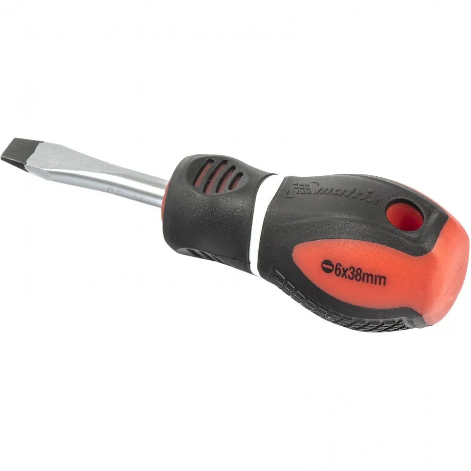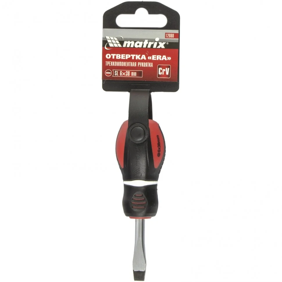 Отвертка Matrix «Era» 12088, SL6 х 38 мм, из стали CrV, с 3-х компонентной рукояткой, позволяет осуществлять монтаж/демонтаж крепежа Slotted «минус». С ней можно произвести монтажные, ремонтные и строительные работы. А благодаря стержню длиной 38 мм можно достать до крепежа в ограниченном пространстве.ПреимуществаЖало и стержень выполнены из высококачественной хромованадиевой стали, это придает им прочность и долговечность.Шлиц прошел индукционную закалку до твердости 50-55 HRC, благодаря чему снижается его стирание и риск залома.Фосфатное покрытие защищает жало от коррозии и обеспечивает улучшенное сцепление с головкой крепежа.Намагниченное жало гарантирует надежное удержание крепежа и позволяет освободить одну руку во время работы.Маркировка рабочих параметров на рукоятке повышает удобство использования отвертки.Трехкомпонентная рукоятка с насечками обеспечивает надежный хват и снижает усталость в руках.