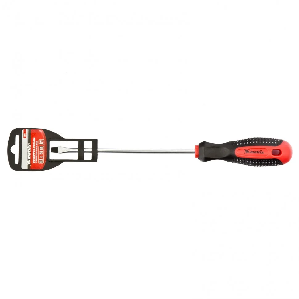 Отвертка Matrix Fusion 11420, SL5,0 х 150 мм, из стали CrV, с 3-х компонентной рукояткой «anti slip», предназначена для завинчивания и отвинчивания резьбового крепежа со шлицем Slotted «минус». Она рассчитана на профессиональное использование для ремонта автомобилей, монтажа конструкций и т.д. Стержень длиной 150 мм делает позволяет работать с крепежом на поверхностях и в углублениях.ПреимуществаСтержень и жало выполнены из износостойкой легированной стали CrV твердостью 50-52 HRC, что обеспечивает долгий срок службы отвертки.Намагниченный наконечник позволяет зафиксировать крепеж и направлять отвертку одной рукой, а другой придерживать закрепляемую деталь.Фосфатированный шлиц обеспечивает улучшенное сцепление с крепежом для удобства работы.Трехкомпонентная рукоятка «anti slip» с подпальцевыми выемками и специальными секциями обеспечивает комфортный и надежный хват без проскальзывания.