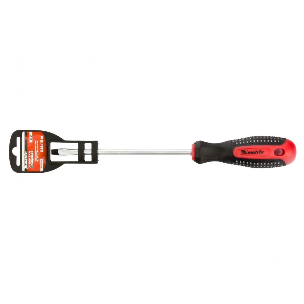 Отвертка Matrix Fusion 11424, SL6,0 х 150 мм, из стали CrV, с 3-х компонентной рукояткой «anti slip», предназначена для завинчивания и отвинчивания резьбового крепежа со шлицем Slotted «минус». Она рассчитана на профессиональное использование для ремонта автомобилей, монтажа конструкций и т.д. Стержень длиной 150 мм делает позволяет работать с крепежом на поверхностях и в углублениях.ПреимуществаСтержень и жало выполнены из износостойкой легированной стали CrV твердостью 50-52 HRC, что обеспечивает долгий срок службы отвертки.Намагниченный наконечник позволяет зафиксировать крепеж и направлять отвертку одной рукой, а другой придерживать закрепляемую деталь.Фосфатированный шлиц обеспечивает улучшенное сцепление с крепежом для удобства работы.Трехкомпонентная рукоятка «anti slip» с подпальцевыми выемками и специальными секциями обеспечивает комфортный и надежный хват без проскальзывания.