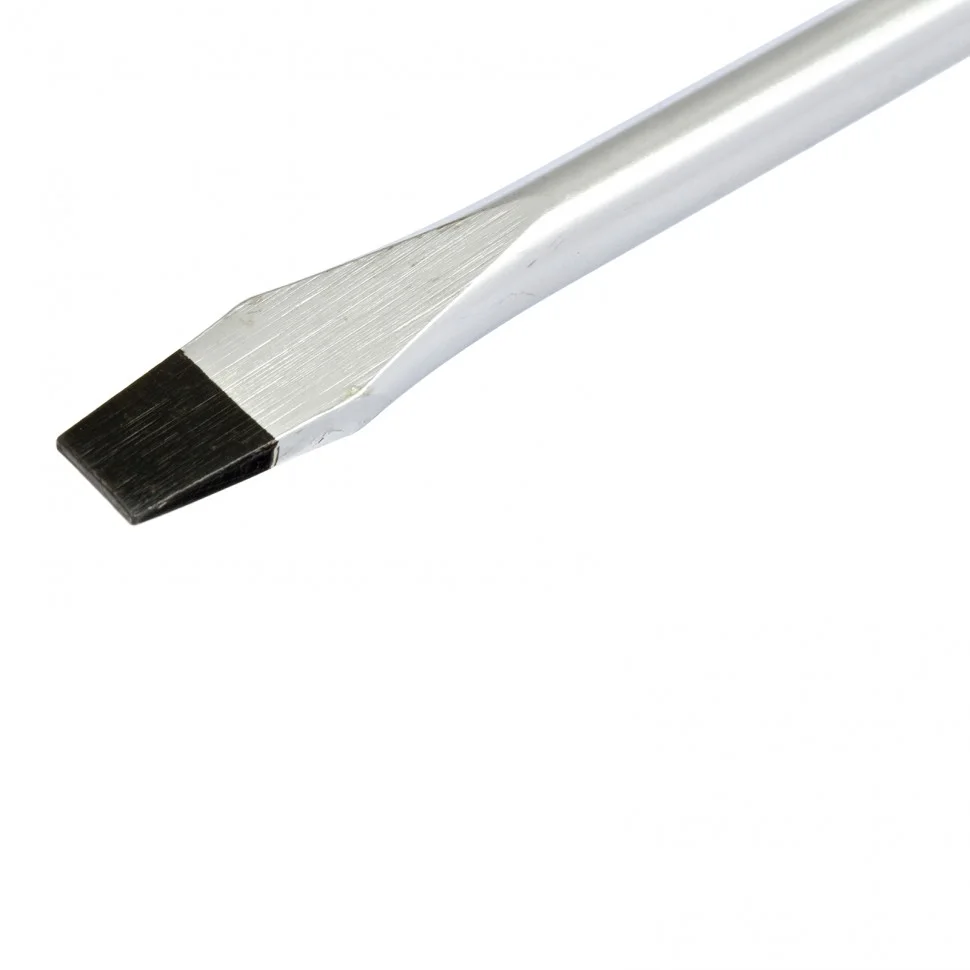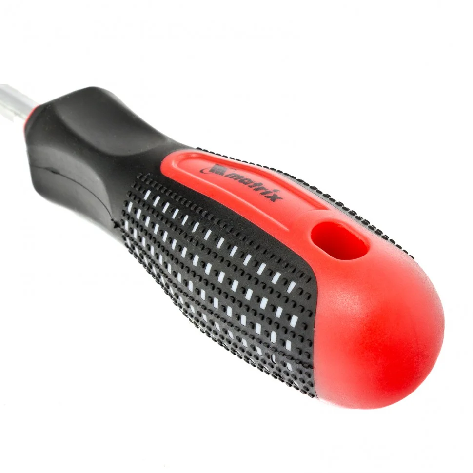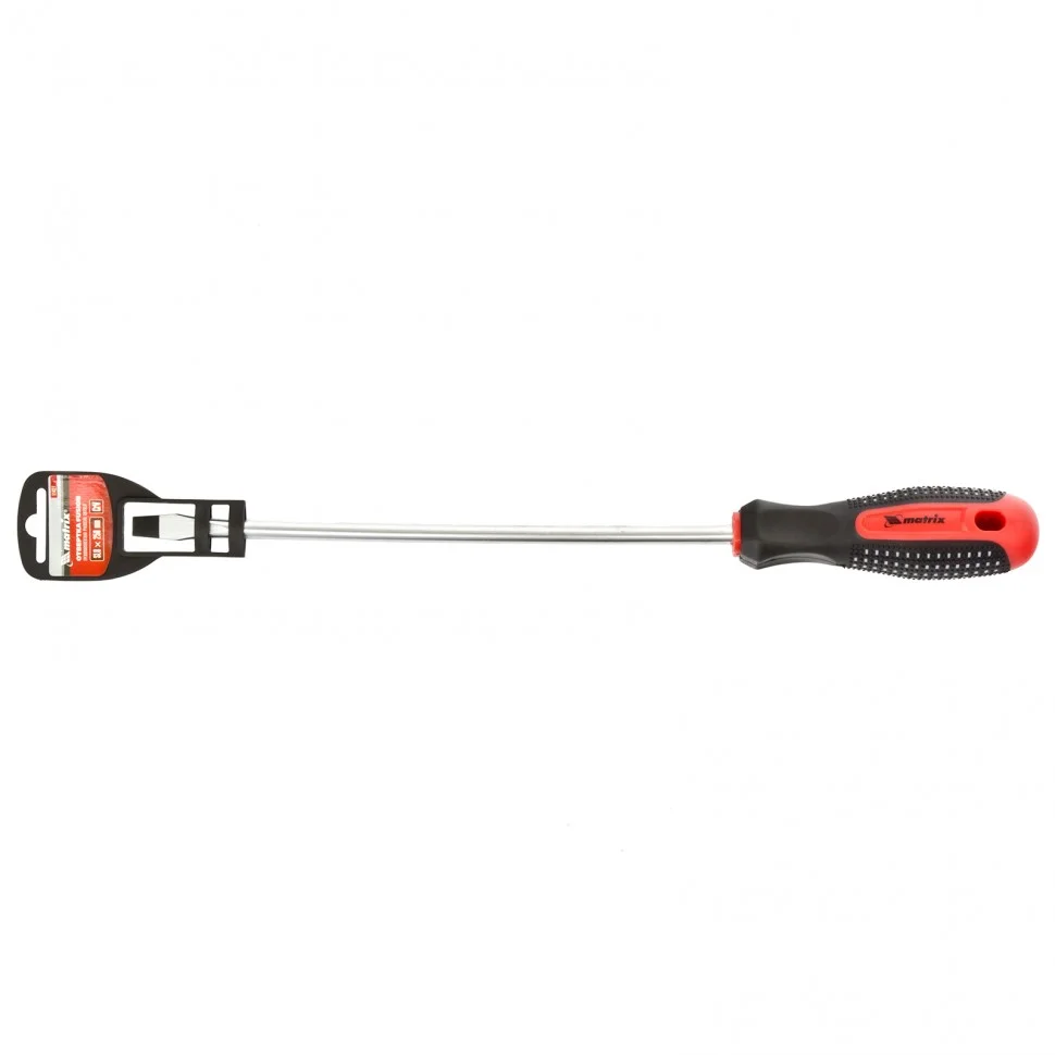 Отвертка Matrix Fusion 11427, SL8,0 х 250 мм, из стали CrV, с 3-х компонентной рукояткой «anti slip», предназначена для завинчивания и отвинчивания резьбового крепежа со шлицем Slotted «минус». Она рассчитана на профессиональное использование для ремонта автомобилей, монтажа конструкций и т.д. Удлиненный до 250 мм стержень делает отвертку оптимальной для работы в значительных углублениях.ПреимуществаСтержень и жало выполнены из износостойкой легированной стали CrV твердостью 50-52 HRC, что обеспечивает долгий срок службы отвертки.Намагниченный наконечник позволяет зафиксировать крепеж и направлять отвертку одной рукой, а другой придерживать закрепляемую деталь.Фосфатированный шлиц обеспечивает улучшенное сцепление с крепежом для удобства работы.Трехкомпонентная рукоятка «anti slip» с подпальцевыми выемками и специальными секциями обеспечивает комфортный и надежный хват без проскальзывания.