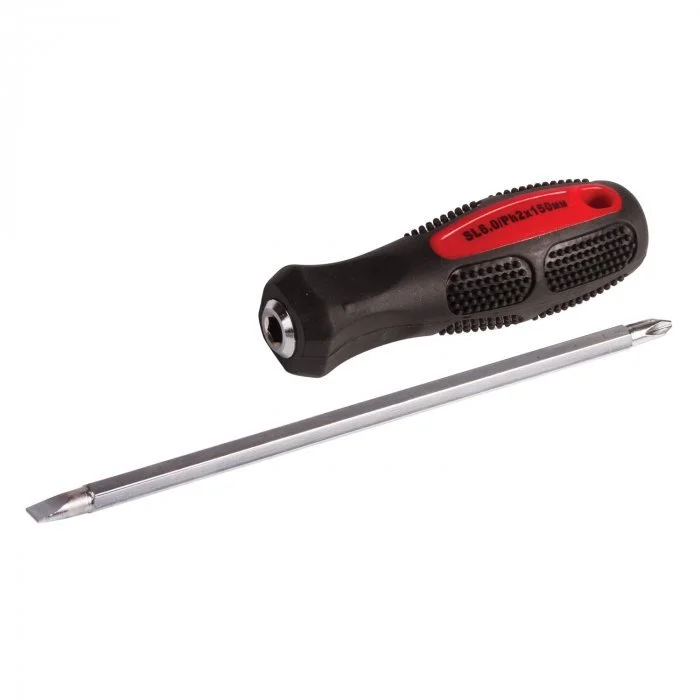- Комбинированная отвертка с профилями «прямой шлиц» (SL – 6 мм) и Phillips (PH – №2) выполнена из хромованадиевой стали.