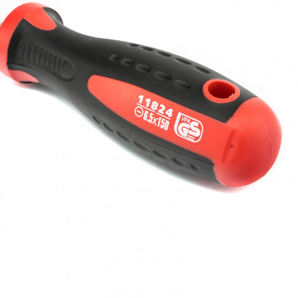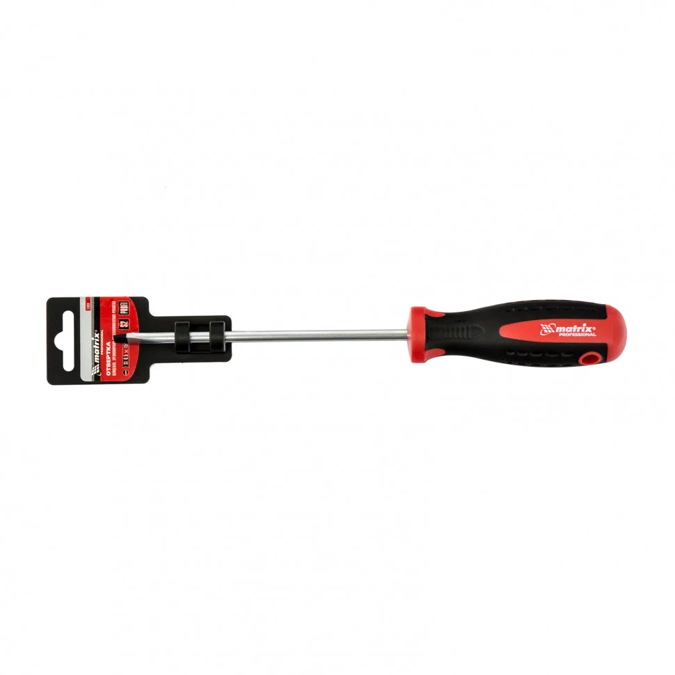 Отвертка Matrix «Profi» 11824, SL6,5 х 150 мм, из стали S2, с двухкомпонентной рукояткой, служит для монтажа и демонтажа крепежа со шлицем Slotted «минус». Профессиональная отвертка станет незаменимым помощником при осуществлении монтажных, строительных и ремонтных работ. Благодаря стержню длиной 150 мм можно закручивать и откручивать крепеж в углублениях.ПреимуществаТвердость и прочность обеспечивается высоким качеством материалов: стержень выполнен из стали CrV, а жало — из закаленной инструментальной стали S2.Рабочая часть фосфатирована, таким образом улучшается сцепление со шлицем крепежа.Намагниченное жало позволяет зафиксировать крепеж и освободить одну руку для удержания закрепляемой детали.Маркировка с рабочими параметрами на рукоятке отвертки обеспечивает удобство эксплуатации.Отвертка произведена на Тайване с высоким контролем качества, что гарантирует ее надежность и долговечность.Трехкомпонентная рукоятка со специальными насечками надежно лежит в руке.Рукоятка выполнена методом цельного литья, что позволяет добиться прочного сцепления с рабочей частью.