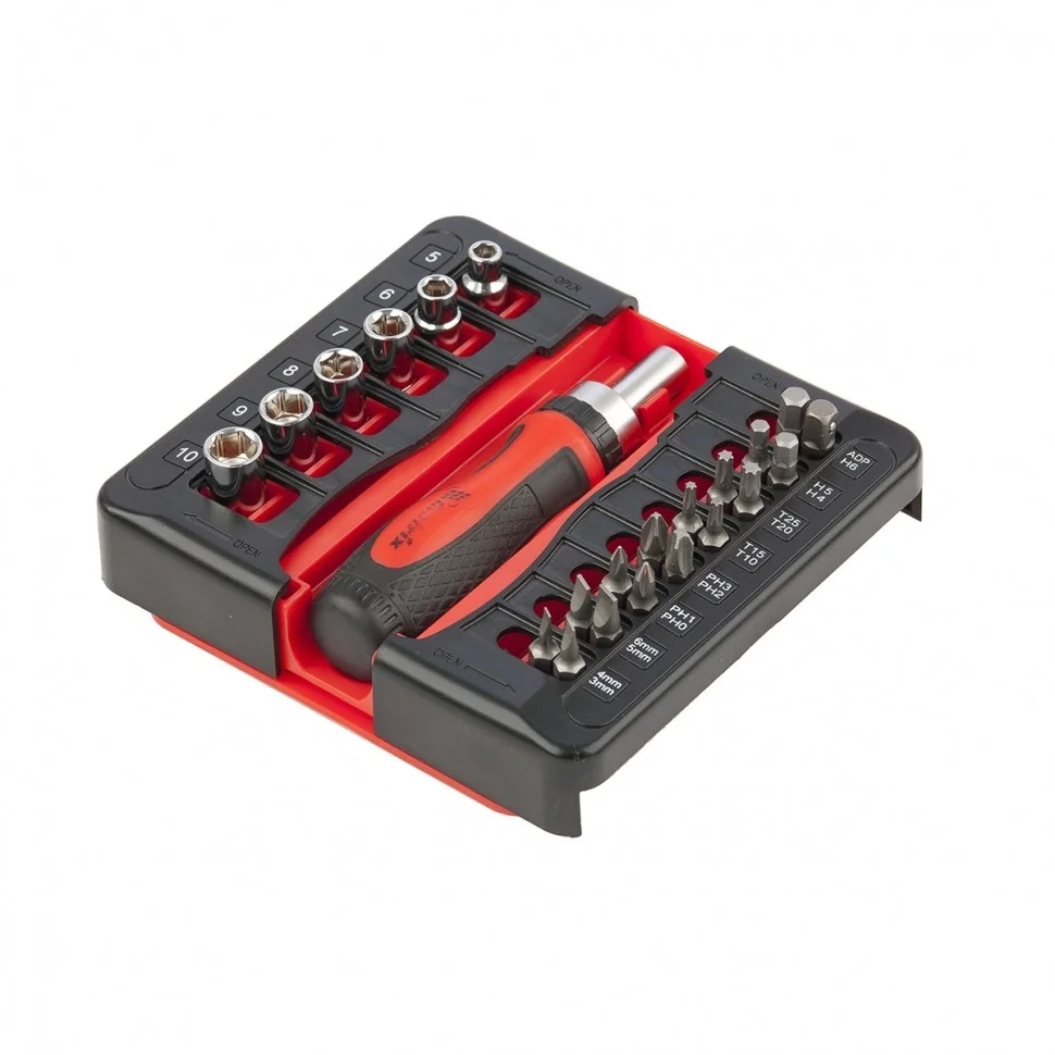 Отвертки с набором бит и торцевых головок предназначены для монтажа и демонтажа резьбовых соединений.Каждый набор включает в себя отвертку с реверсивным механизмом, повышающим комфорт и скорость выполнения работы.В комплект входят битыи торцевые головки различного типоразмера, изготовленные из хромованадиевой стали.Для удобства хранения и транспортировки наборы упакованы в пластиковые кейсы.