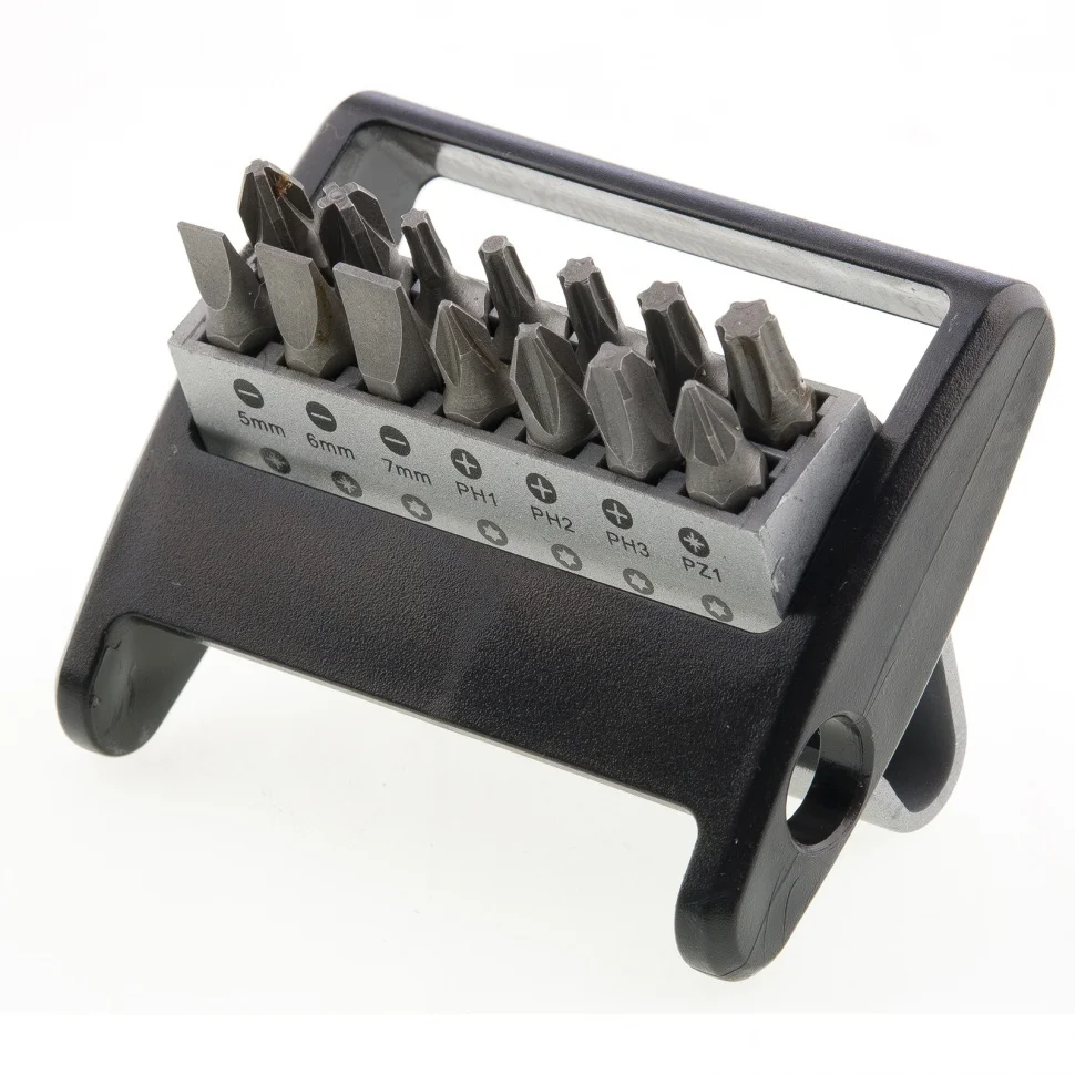 Отвертка Matrix 11337 с набором бит из 14 шт. из стали CrV служит для откручивания и закручивания резьбовых крепежей со шлицами SL, PH, PZ и Torx. Заменяет комплект стандартных отверток. Присоединительный шестигранник с магнитом надежно удерживает биту, не давая ей выскочить во время работы. Набор подходит для профессионального и бытового применения.ПреимуществаБиты изготовлены из прочной стали хромованадиевой группы, поэтому обладают высоким рабочим ресурсом.Двухкомпонентная рукоятка с подпальцевыми выемками и рельефным рисунком не выскальзывает из ладони, обеспечивая комфорт во время работы.В тыльной части рукоятки имеется отверстие для подвесного хранения.Насадки поставляются в удобном держателе с обозначениями размеров и типов шлицев, что упрощает хранение и подбор бит.