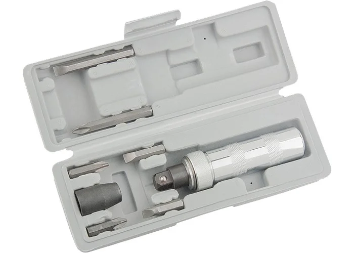 Ударно-поворотная отвертка Matrix 11575 с присоединительным шестигранником 1/2 дюйма, с набором бит из 6 шт., в пластиковом боксе, используется для закручивания и откручивания крепежей, в том числе для демонтажа перетянутых или застарелых резьбовых соединений. Насадки подходят для крепежных элементов со щлицами PH и SL. Мощный стальной корпус с металлическим затыльником выдерживает удары молотка. Набор будет полезен во время ремонта оборудования, автомобилей, а также для выполнения других профессиональных работ.ПреимуществаБиты изготовлены из прочной стали хромованадиевой группы, поэтому выдерживают повышенные механические нагрузки.Под съемной головкой имеется присоединительный квадрат 1/4 дюйма, поэтому отвертка может использоваться с торцевыми головками.Набор поставляется в пластиковом кейсе с ложементами, поэтому удобен в хранении и транспортировке.