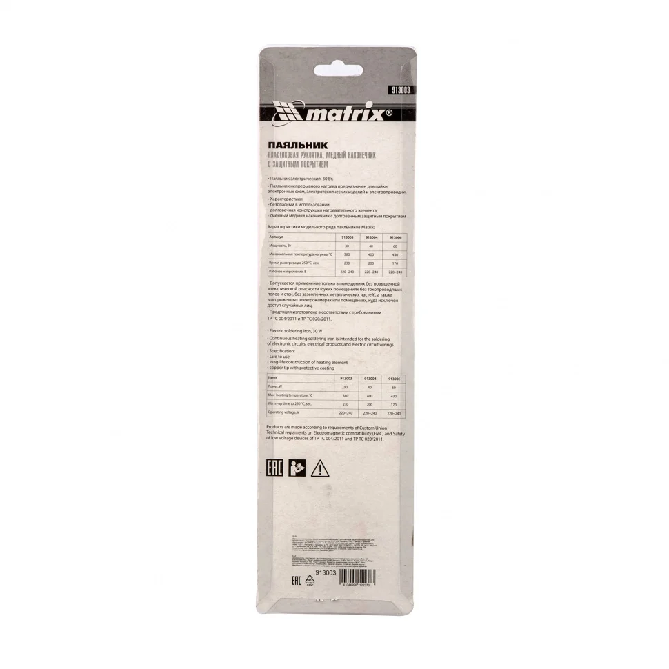 Паяльник Matrix 913003, 220 В, 30 W, с пластиковой рукояткой, имеет медный наконечник с долговечным гальваническим защитным покрытием, надежно защищающим его от внешних воздействий. Жало имеет конусовидную форму, что удобно при выполнении точных работ. Благодаря нагревательному элементу в виде нихромовой спирали паяльник устойчив к повреждениям. Инструмент используется для пайки проводов, микрочипов, электрических схем и транзисторов. Будет полезен для ремонта автомобилей, электроники и бытовой техники.ПреимуществаЖало имеет медный сердечник, поэтому быстро нагревается.На рабочую поверхность нанесено хромированное покрытие, предотвращающее образование коррозии и улучшающее прилипание припоя.Если жало выйдет из строя, его легко можно будет заменить.Эргономичная рукоятка из высококачественного пластика надежно лежит в руке, снижая нагрузку на кисть во время длительной работы.Инструмент изготовлен в соответствии с требованиями ТР ТС 004/2011 и ТР ТС 0020/2011, что подтверждает его безопасность.