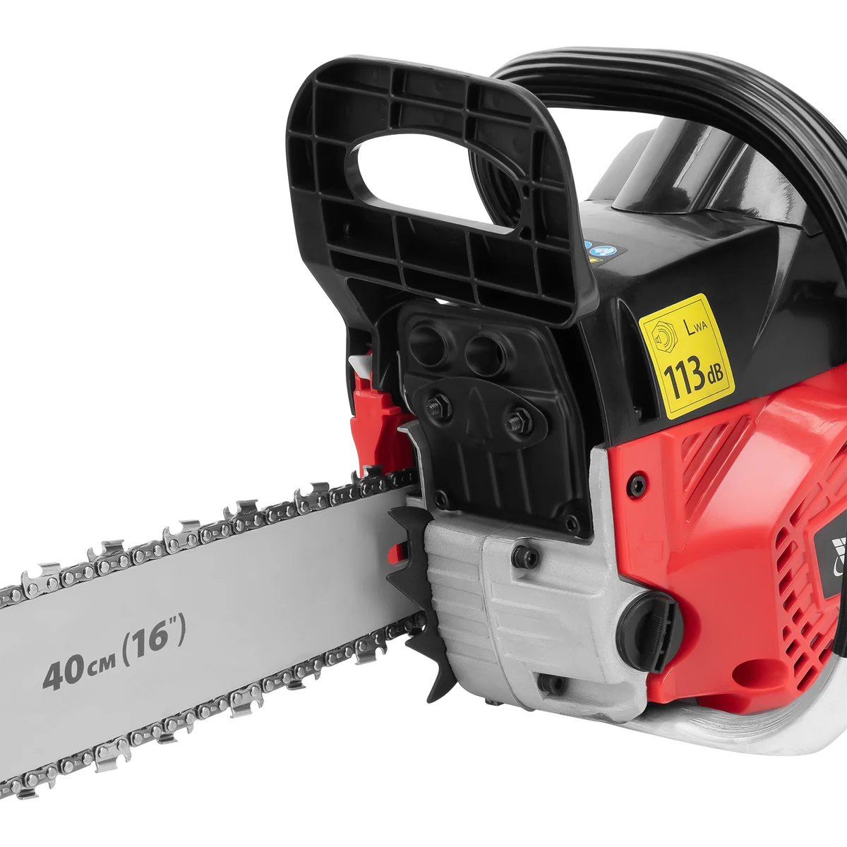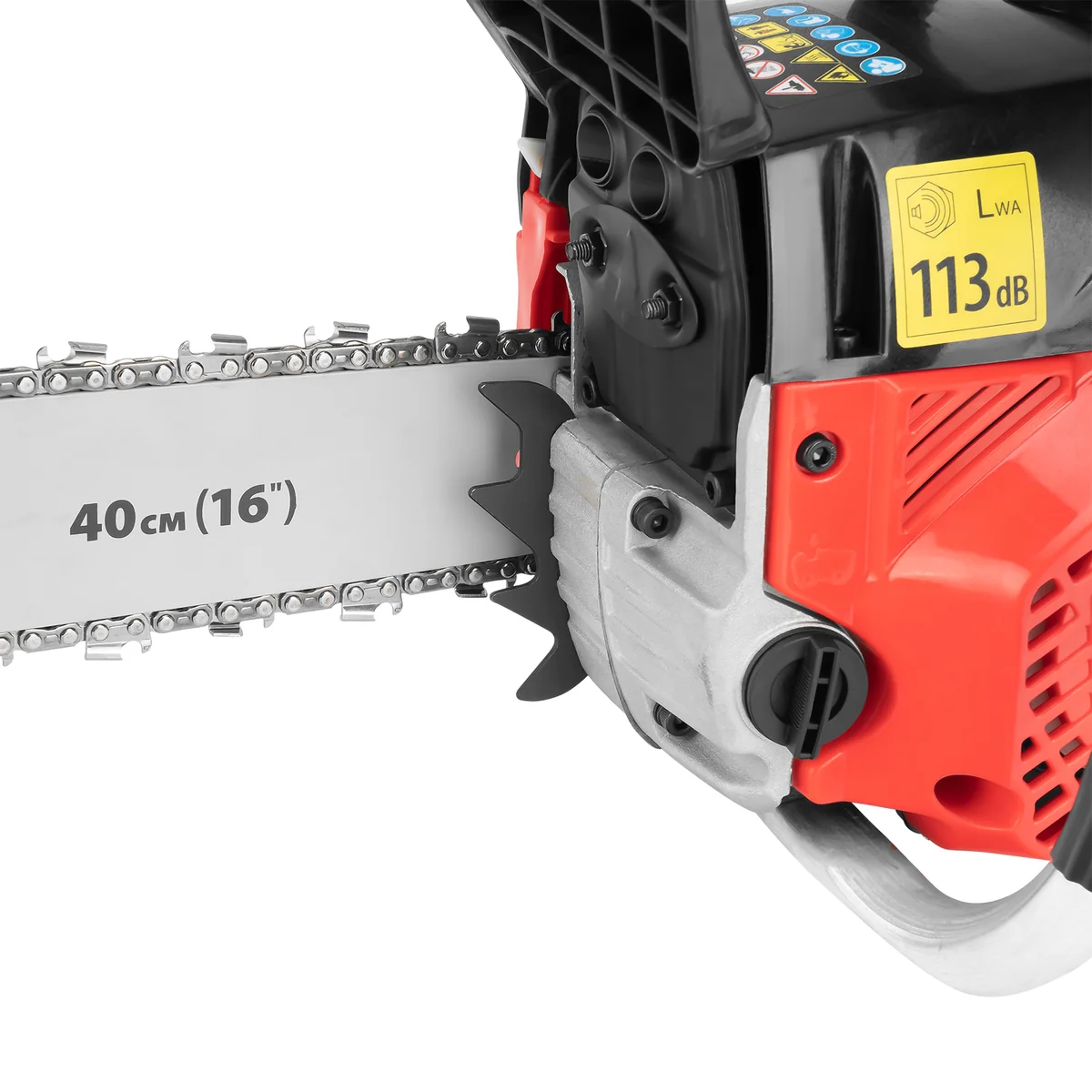 - Безопасная эксплуатация — функция блокировки газа предотвращает случайный запуск, тормоз цепи снижает риск травмирования при отскоке пилы.