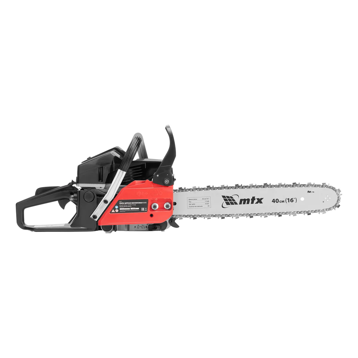 Цепная бензиновая пила MTX MS-4516 95211 оснащена двигателем объемом 45 см3 и мощностью 2,5 л.с. Предназначена для распиловки древесины, используется для валки деревьев, а также для распиливания веток, опиливания сучков и заготовки дров. Комплектуется шиной длиной 40 см, с шагом цепи 0,325″ и 64 звеньями, с пазом 1,5 мм. Будет полезна для проведения ремонтных, строительных работ, облагораживания сада и т.д.
