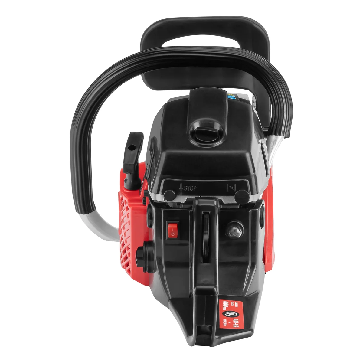 - Безопасная эксплуатация — функция блокировки газа предотвращает случайный запуск, тормоз цепи снижает риск травмирования при отскоке пилы.