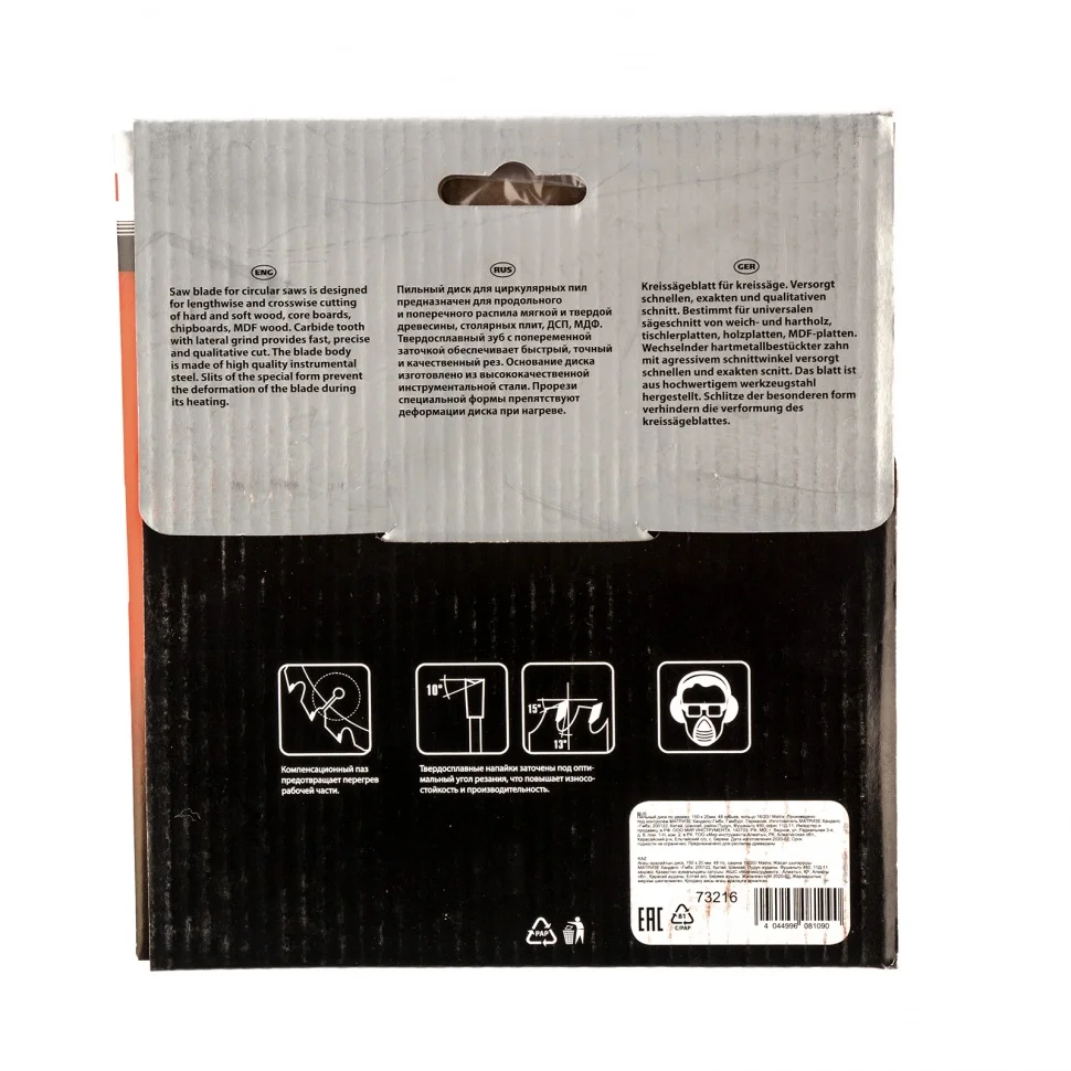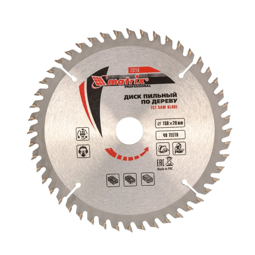 Пильный диск по дереву Matrix ф150 х 20 мм 73216 с 48 зубьями и переходным кольцом 20/16 применяется в качестве оснастки на циркулярных и торцовочных пилах с соответствующим внутренним и внешним диаметром. Он используется преимущественно для поперечного реза материалов из мягкой и твердой древесины, ДСП, ДВП, фанеры, столярных плит. В комплект входит переходное кольцо 20/16 для возможности самостоятельного изменения посадочного диаметра при необходимости.ПреимуществаМелкие зубья с попеременной заточкой обеспечивают точность, качество реза и получение чистых кромок, диск подходит для бытового и профессионального применения.Основание выполнено из стали 65Mn, а режущая пластина - из сплава YG8 твердостью более 88 HRA, поэтому диск имеет высокий ресурс и долго сохраняет заточку.Зубья прошли алмазную заточку, что повышает эффективность реза и позволяет увеличить срок службы диска.Компенсационные прорези снижают риск заклинивания диска, делают рез максимально точным и стабильным.