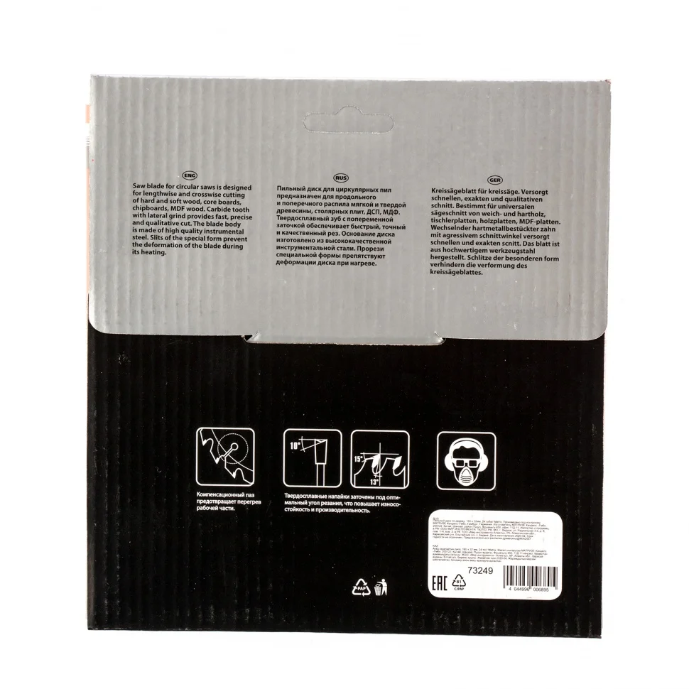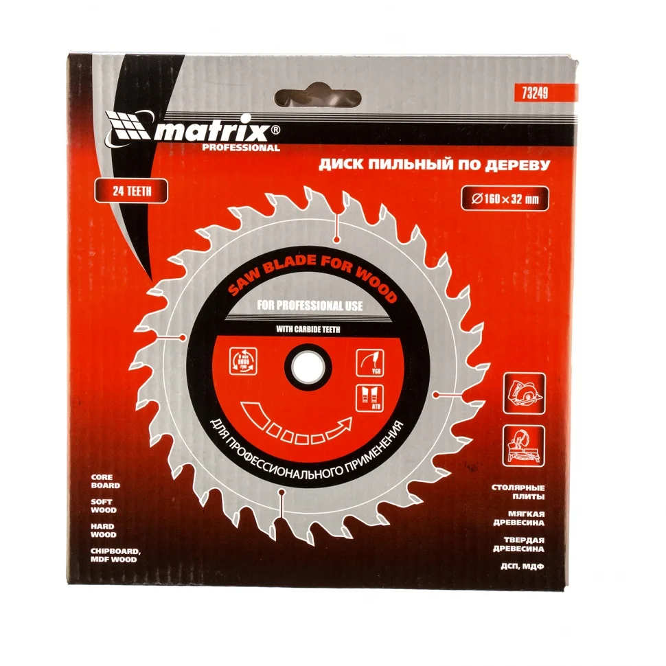 Пильный диск по дереву Matrix ф160 х 32 мм 73249 с 24 зубьями применяется в качестве оснастки на циркулярных и торцовочных пилах с соответствующим внутренним и внешним диаметром. Он используется для продольного/поперечного реза материалов из мягкой и твердой древесины, ДСП, ДВП, фанеры, столярных плит.ПреимуществаКрупные зубья с попеременной заточкой обеспечивают высокую скорость работы и качественный распил материалов, диск оптимально подходит для бытового и профессионального применения.Основание выполнено из стали 65Mn, а режущая пластина - из сплава YG8 твердостью более 88 HRA, поэтому диск имеет высокий ресурс и долго сохраняет заточку.Зубья прошли алмазную заточку, что повышает эффективность реза и позволяет увеличить срок службы диска.Компенсационные прорези снижают риск заклинивания диска, делают рез максимально точным и стабильным.