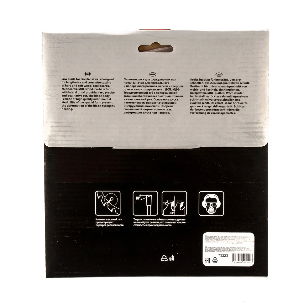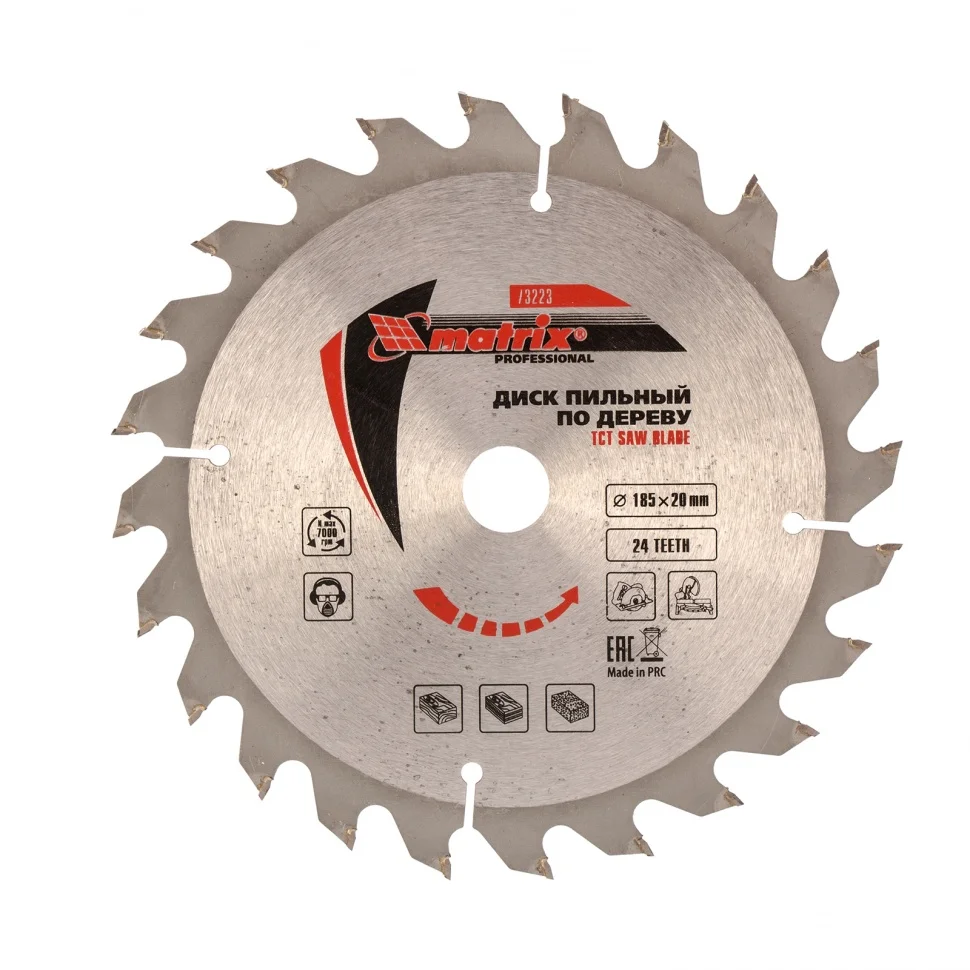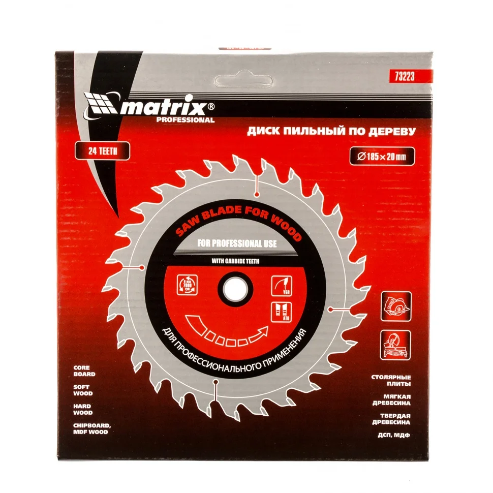 Пильный диск по дереву Matrix ф185 х 20 мм 73223 с 24 зубьями и переходным кольцом 20/16 применяется в качестве оснастки на циркулярных и торцовочных пилах с соответствующим внутренним и внешним диаметром. Он используется для продольного/поперечного реза материалов из мягкой и твердой древесины, ДСП, ДВП, фанеры, столярных плит. В комплект входит переходное кольцо 20/16 для возможности самостоятельного изменения посадочного диаметра при необходимости.ПреимуществаКрупные зубья с попеременной заточкой обеспечивают высокую скорость работы и качественный распил материалов, диск оптимально подходит для бытового и профессионального применения.Основание выполнено из стали 65Mn, а режущая пластина - из сплава YG8 твердостью более 88 HRA, поэтому диск имеет высокий ресурс и долго сохраняет заточку.Зубья прошли алмазную заточку, что повышает эффективность реза и позволяет увеличить срок службы диска.Компенсационные прорези снижают риск заклинивания диска, делают рез максимально точным и стабильным.