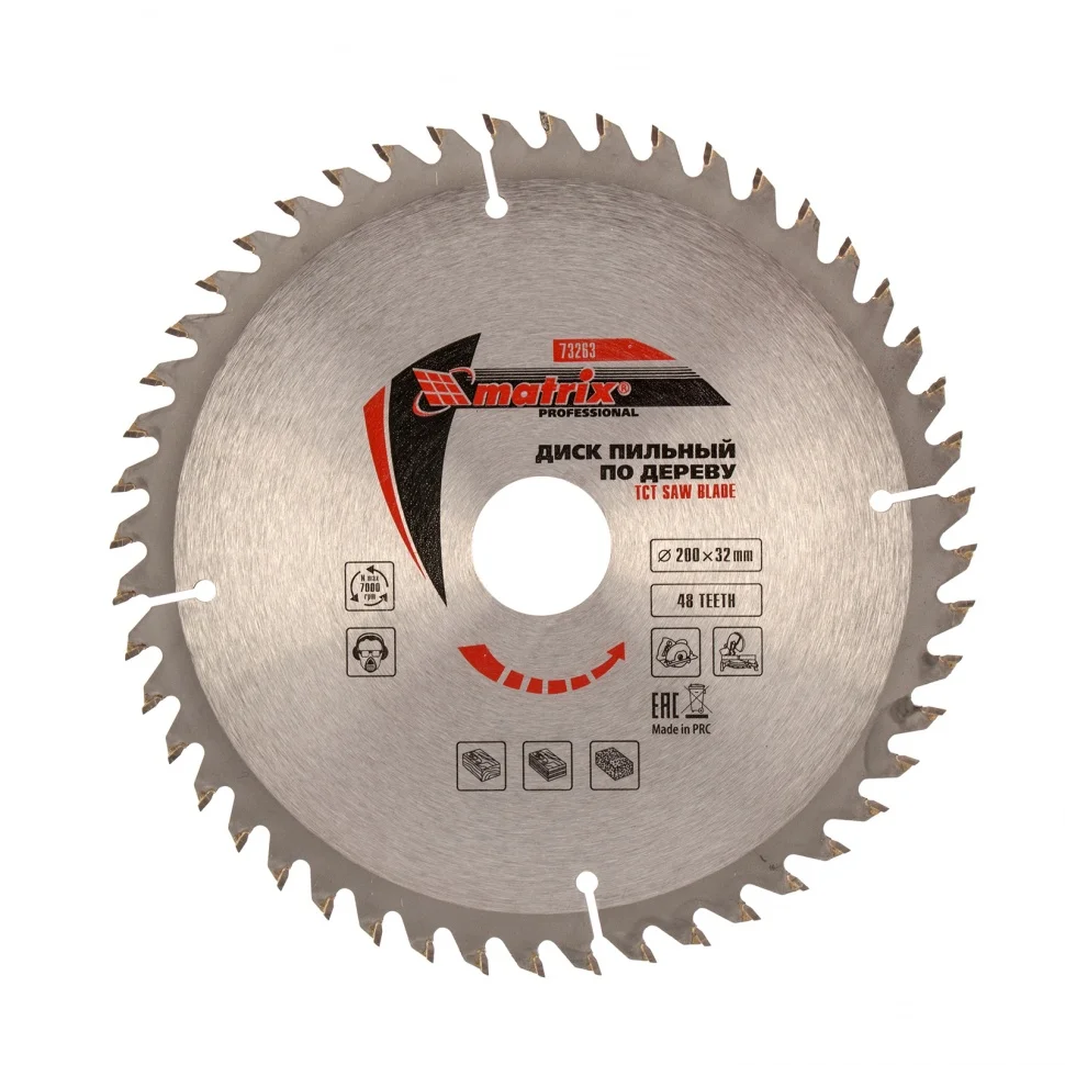 Пильный диск по дереву Matrix ф200 х 32 мм 73263 с 48 зубьями и переходным кольцом 32/30 применяется в качестве оснастки на циркулярных и торцовочных пилах с соответствующим внутренним и внешним диаметром. Он используется преимущественно для поперечного реза материалов из мягкой и твердой древесины, ДСП, ДВП, фанеры, столярных плит. В комплект входит переходное кольцо 32/30 для возможности самостоятельного изменения посадочного диаметра при необходимости.ПреимуществаМелкие зубья с попеременной заточкой обеспечивают точность, качество реза и получение чистых кромок, диск подходит для бытового и профессионального применения.Основание выполнено из стали 65Mn, а режущая пластина - из сплава YG8 твердостью более 88 HRA, поэтому диск имеет высокий ресурс и долго сохраняет заточку.Зубья прошли алмазную заточку, что повышает эффективность реза и позволяет увеличить срок службы диска.Компенсационные прорези снижают риск заклинивания диска, делают рез максимально точным и стабильным.