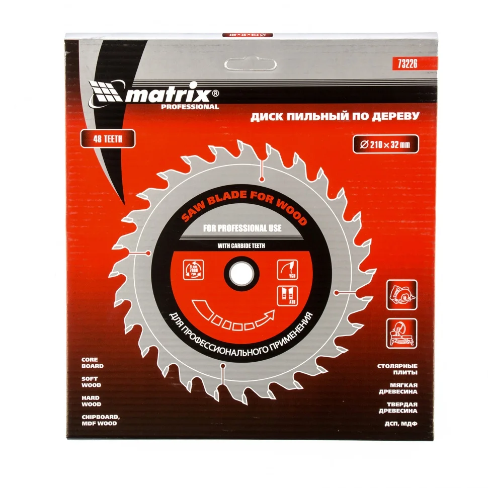 Пильный диск по дереву Matrix ф210 х 32 мм 73226 с 48 зубьями и переходным кольцом 32/30 применяется в качестве оснастки на циркулярных и торцовочных пилах с соответствующим внутренним и внешним диаметром. Он используется преимущественно для поперечного реза материалов из мягкой и твердой древесины, ДСП, ДВП, фанеры, столярных плит. В комплект входит переходное кольцо 32/30 для возможности самостоятельного изменения посадочного диаметра при необходимости.ПреимуществаМелкие зубья с попеременной заточкой обеспечивают точность, качество реза и получение чистых кромок, диск подходит для бытового и профессионального применения.Основание выполнено из стали 65Mn, а режущая пластина - из сплава YG8 твердостью более 88 HRA, поэтому диск имеет высокий ресурс и долго сохраняет заточку.Зубья прошли алмазную заточку, что повышает эффективность реза и позволяет увеличить срок службы диска.Компенсационные прорези снижают риск заклинивания диска, делают рез максимально точным и стабильным.