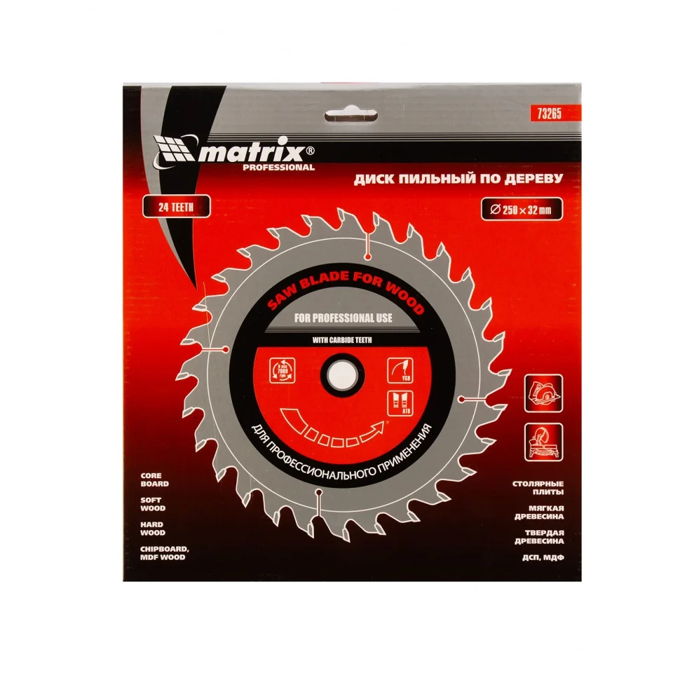 Пильный диск по дереву Matrix ф250 х 32 мм 73265 с 24 зубьями применяется в качестве оснастки на циркулярных и торцовочных пилах с соответствующим внутренним и внешним диаметром. Он используется для продольного/поперечного реза материалов из мягкой и твердой древесины, ДСП, ДВП, фанеры, столярных плит.ПреимуществаКрупные зубья с попеременной заточкой обеспечивают высокую скорость работы и качественный распил материалов, диск оптимально подходит для бытового и профессионального применения.Основание выполнено из стали 65Mn, а режущая пластина - из сплава YG8 твердостью более 88 HRA, поэтому диск имеет высокий ресурс и долго сохраняет заточку.Зубья прошли алмазную заточку, что повышает эффективность реза и позволяет увеличить срок службы диска.Компенсационные прорези снижают риск заклинивания диска, делают рез максимально точным и стабильным.