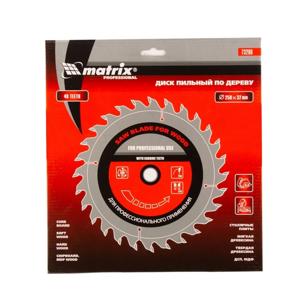 Пильный диск по дереву Matrix ф250 х 32 мм 73266 с 48 зубьями применяется в качестве оснастки на циркулярных и торцовочных пилах с соответствующим внутренним и внешним диаметром. Он используется преимущественно для поперечного реза материалов из мягкой и твердой древесины, ДСП, ДВП, фанеры, столярных плит.ПреимуществаМелкие зубья с попеременной заточкой обеспечивают точность, качество реза и получение чистых кромок, диск подходит для бытового и профессионального применения.Основание выполнено из стали 65Mn, а режущая пластина - из сплава YG8 твердостью более 88 HRA, поэтому диск имеет высокий ресурс и долго сохраняет заточку.Зубья прошли алмазную заточку, что повышает эффективность реза и позволяет увеличить срок службы диска.Компенсационные прорези снижают риск заклинивания диска, делают рез максимально точным и стабильным.