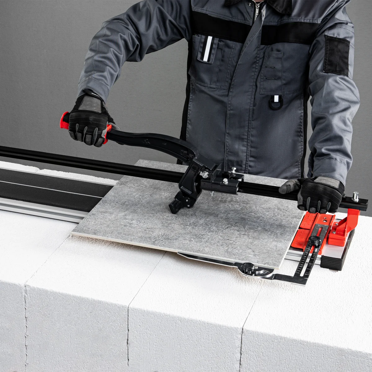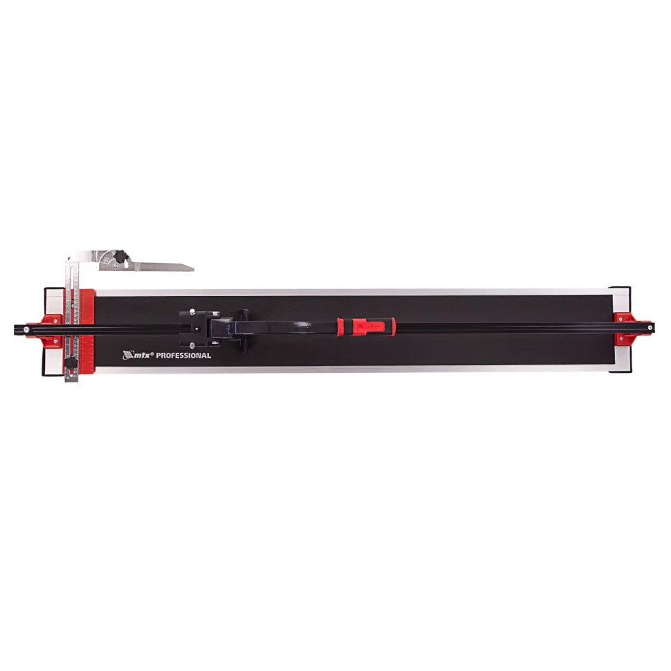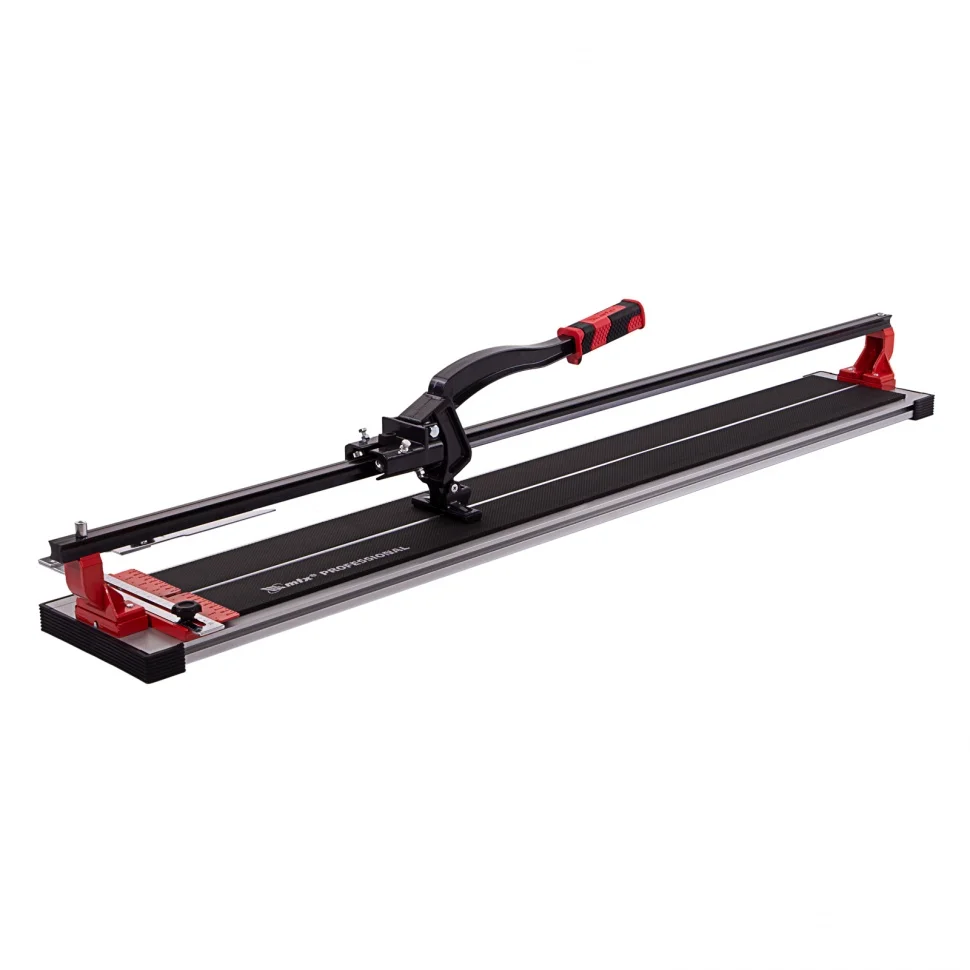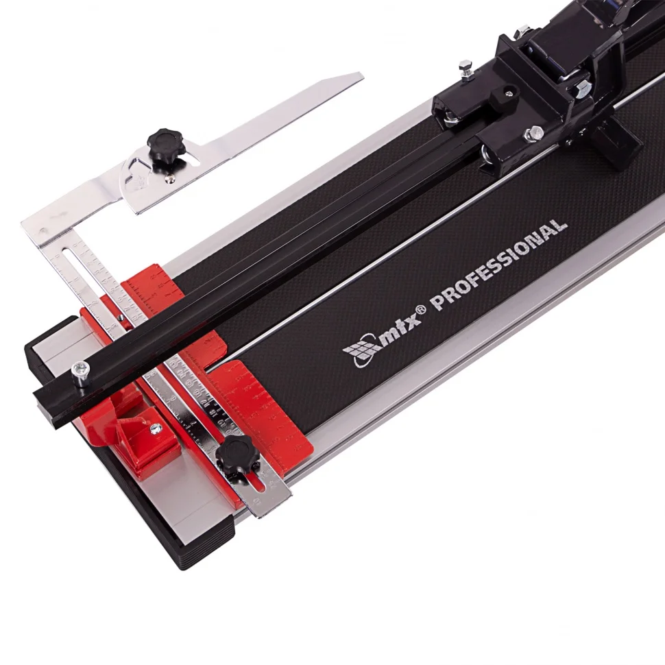 Рельсовый плиткорез MTX 87693 поможет придать необходимый размер плитке длиной до 1200 мм и толщиной до 16 мм. Пригодится в ходе проведения облицовочных работ. Мощный разделитель справится с резкой любого типа плитки, включая керамическую и керамогранитную. Благодаря продуманной конструкции плиткореза можно производить разлом в любой точке поверхности плитки.ПреимуществаПовышенная износостойкость — сменный режущий ролик из твердого сплава ВК-8 рассчитан на долгий срок службы.Плавный и легкий ход — в конструкции использован качественный направляющий рельс из стального сплава с антикоррозийным покрытием и надежный шарикоподшипниковый механизм.Поворотный угольник-угломер — плитка режется под углом до 45 градусов, размер заготовки удобно регулируется и можно дополнительно фиксировать ее.Полное отсутствие люфта между кареткой и рельсом и максимальная устойчивость рукоятки при резке — прижимной обхват рельса каретки регулируется специальным болтами.Надежный захват — удобная обрезиненная рукоятка исключает скольжение руки при выполнении работ.Мобильность — станина из алюминиевого сплава не утяжеляет конструкцию инструмента, поэтому его удобно транспортировать.