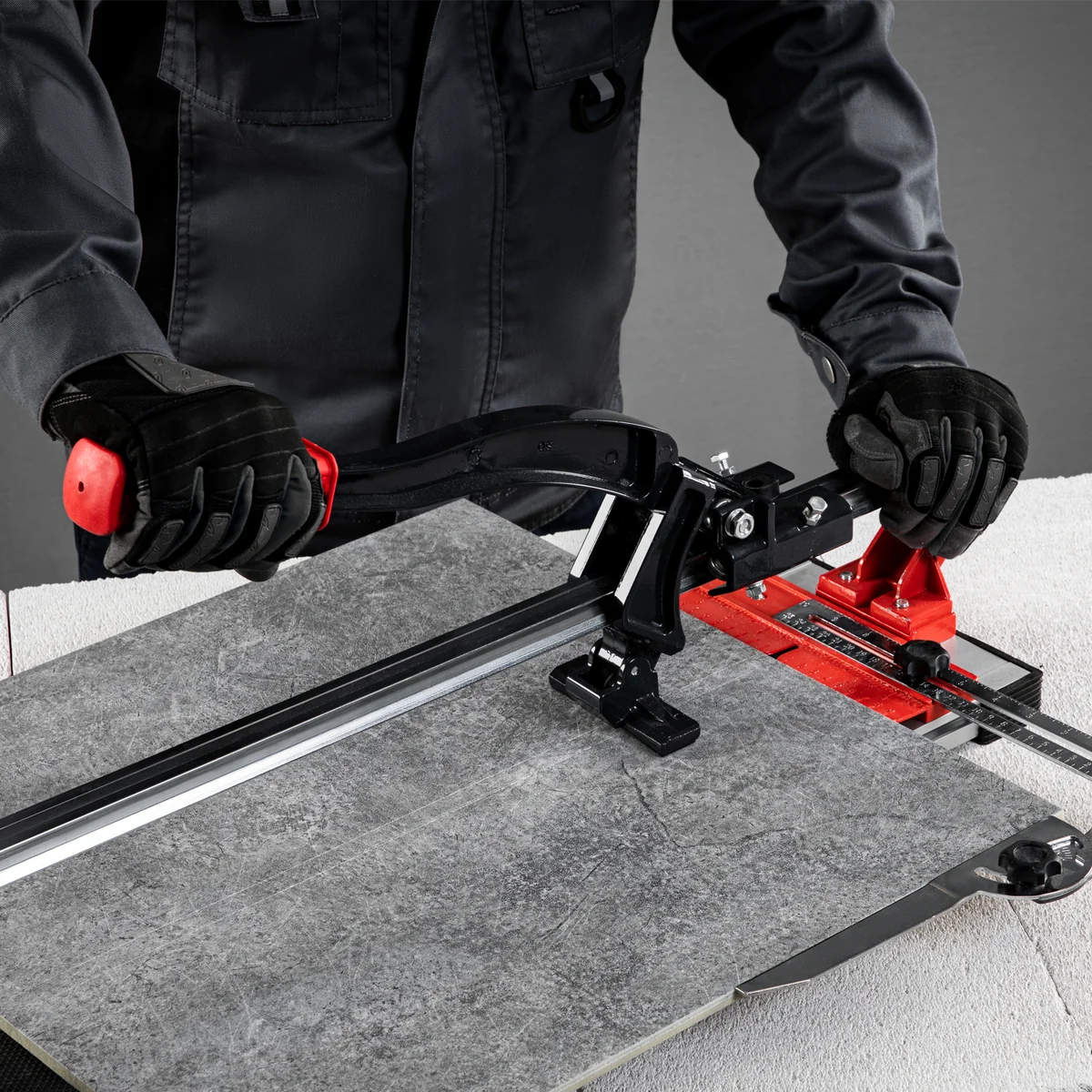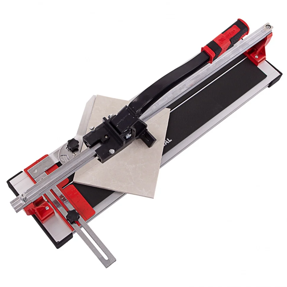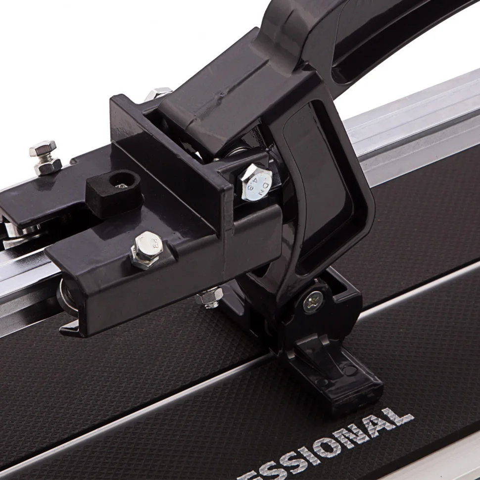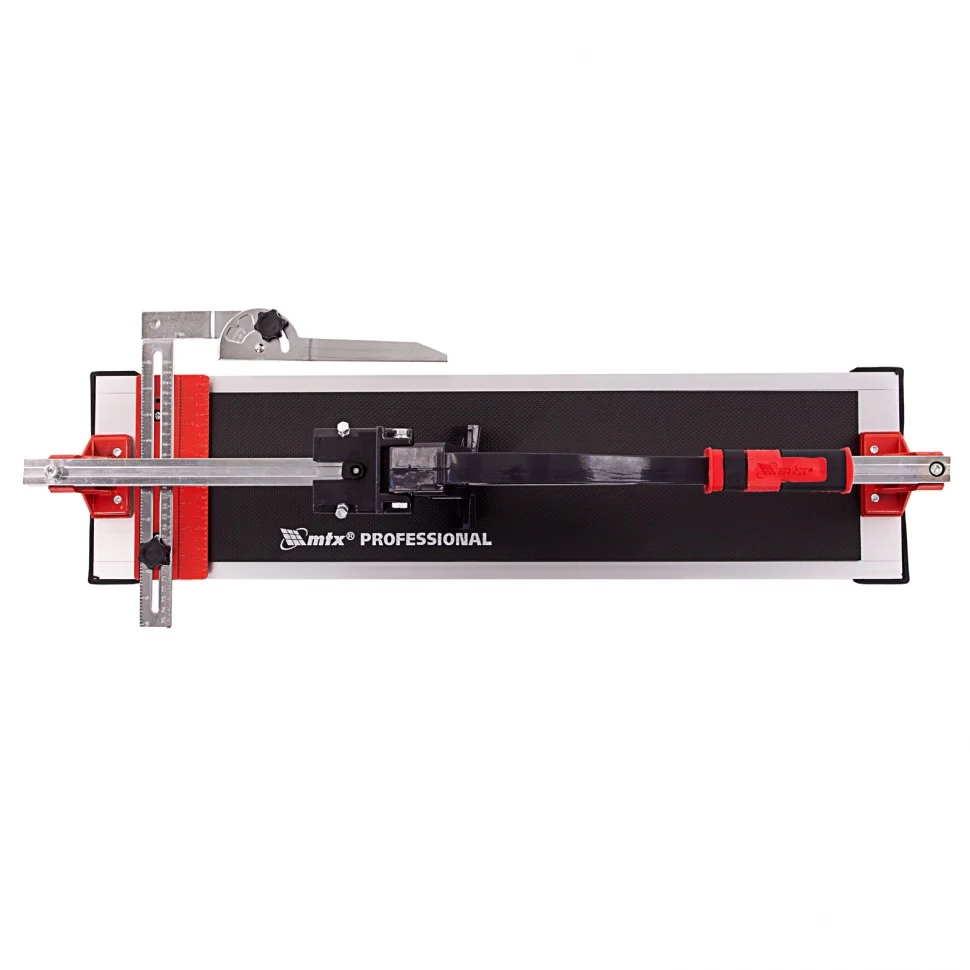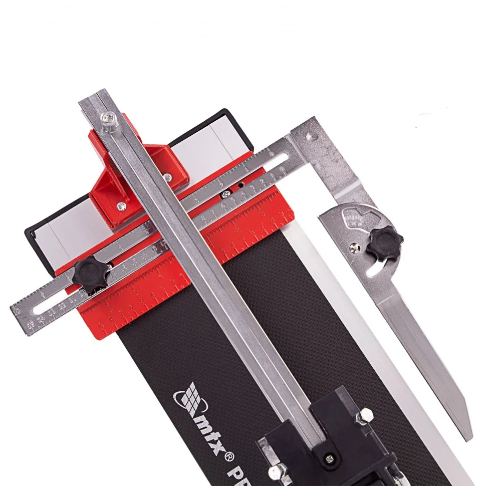 Рельсовый плиткорез MTX 87688 поможет придать необходимый размер плитке длиной до 600 мм и толщиной до 16 мм. Пригодится в ходе проведения облицовочных работ. Мощный разделитель справится с резкой любого типа плитки, включая керамическую и керамогранитную. Благодаря продуманной конструкции плиткореза можно производить разлом в любой точке поверхности плитки.ПреимуществаПовышенная износостойкость — сменный режущий ролик из твердого сплава ВК-8 рассчитан на долгий срок службы.Плавный и легкий ход — в конструкции использован качественный направляющий рельс из стального сплава с антикоррозийным покрытием и надежный шарикоподшипниковый механизм.Поворотный угольник-угломер — плитка режется под углом до 45 градусов, размер заготовки удобно регулируется и можно дополнительно фиксировать ее.Полное отсутствие люфта между кареткой и рельсом и максимальная устойчивость рукоятки при резке — прижимной обхват рельса каретки регулируется специальным болтами.Надежный захват — удобная обрезиненная рукоятка исключает скольжение руки при выполнении работ.Мобильность — станина из алюминиевого сплава не утяжеляет конструкцию инструмента, поэтому его удобно транспортировать.