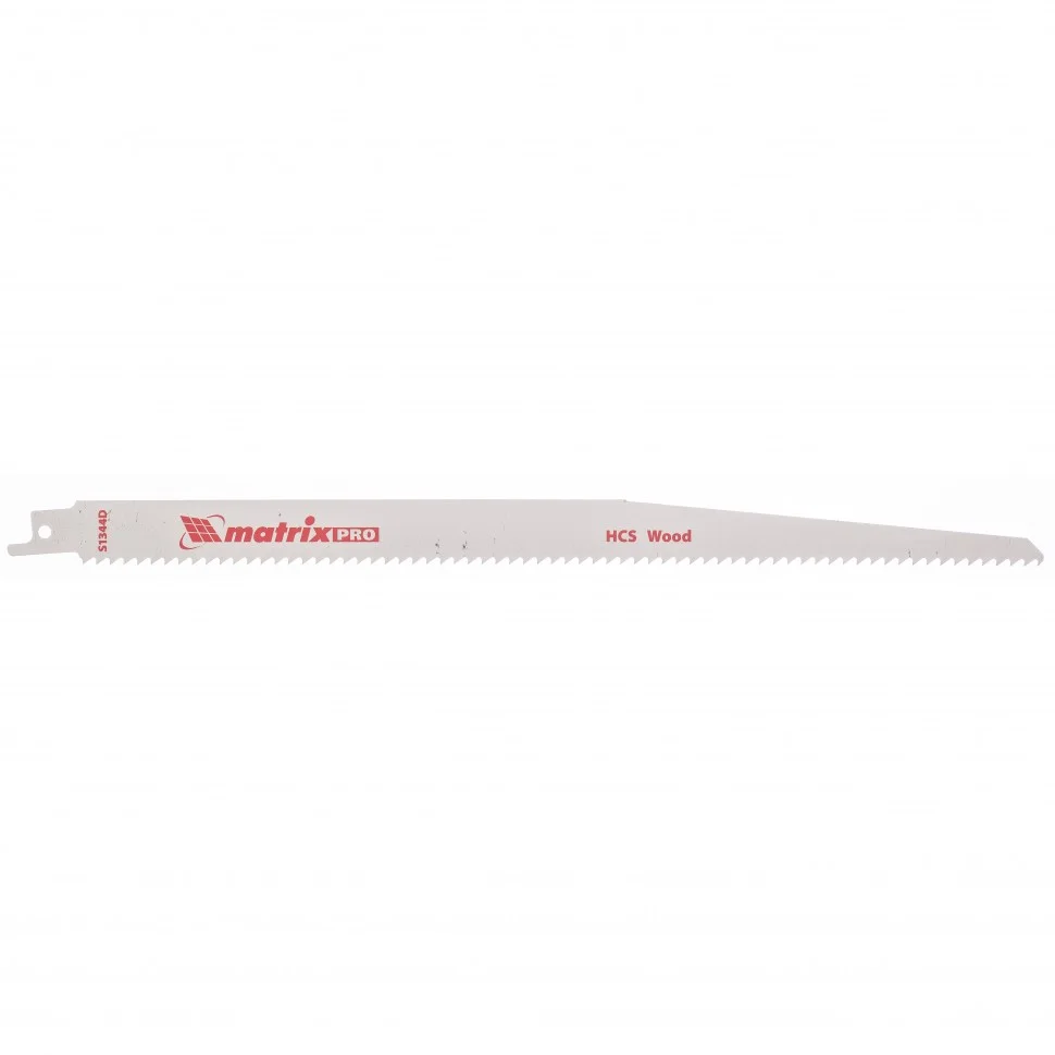 Полотна по дереву для сабельной пилы Matrix PRO 782011, S1344D, 275/4,3 мм, HCS, совместимы с большинством электрических пил ведущих производителей. Они производят прямой распил мягкой и твердой древесины, ДСП, фанеры и пластика. Толщина пропила может доходить до 230 мм. Пилки подойдут для обрезки сучьев деревьев. Будут полезны при проведении столярных работ в профессиональной сфере и в быту. Преимущества Полотна обладают высокой прочностью и долговечностью, т.к. изготовлены из высокоуглеродистой стали У8, устойчивой к нагрузкам и механическим повреждениям. Зубья отличаются стойкостью к истиранию, поскольку закалены в вакуумной печи до твердости 48-53 HRC. Пилки характеризуются высокой производительностью, т.к. благодаря шагу зубьев 4,3 мм обеспечивают быстрый распил.