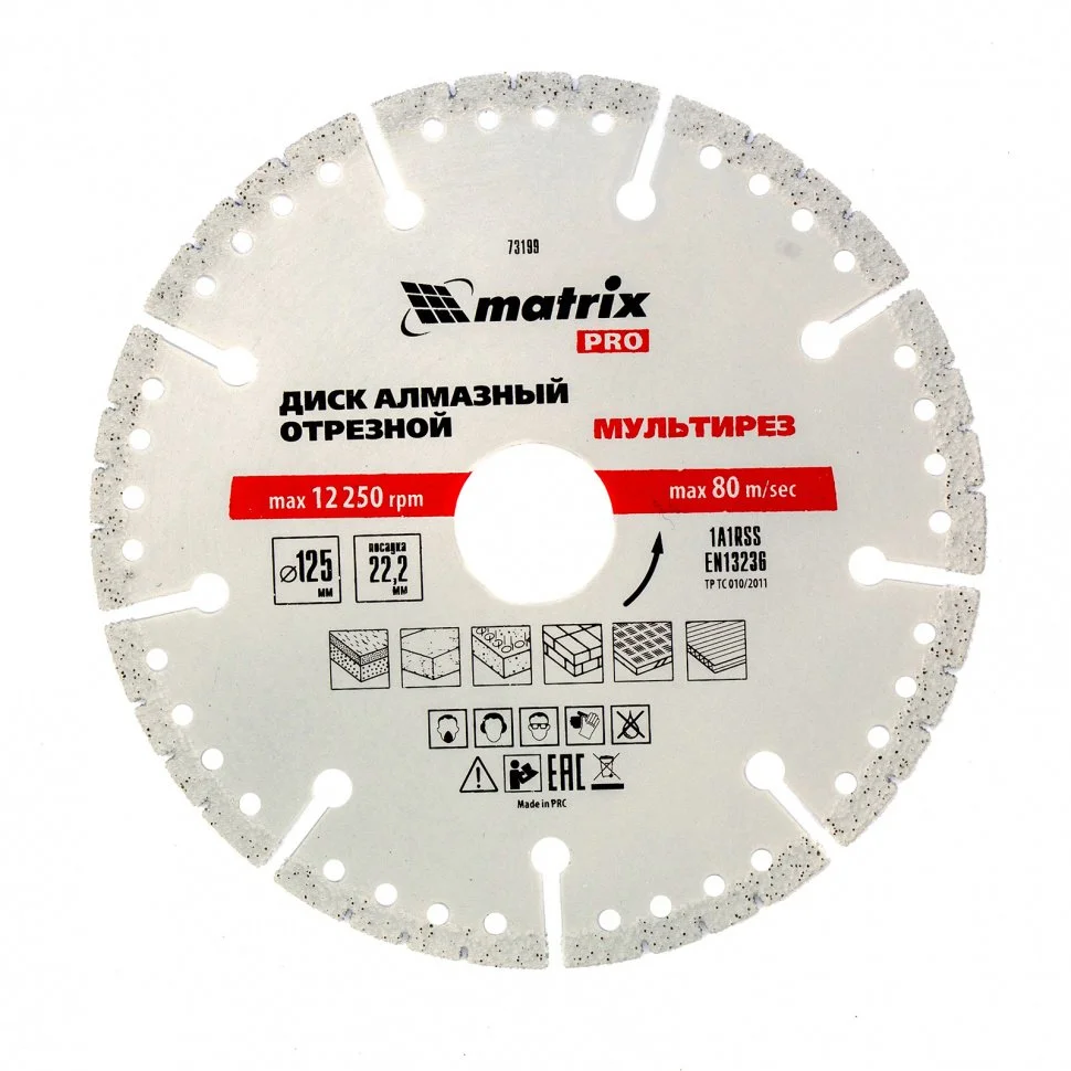 Алмазный отрезной диск Matrix PRO Мультирез 73199, 125 х 22,2 мм, применяется для сухого и мокрого резания бетона любой твердости, железобетона, гранита, кирпича, металла, древесины, пластика и других материалов. Используется в качестве универсального режущего инструмента в профессиональной сфере, например, строительными, специальными службами, сотрудниками МЧС. К работе с диском необходимо приступать после ознакомления с руководством пользователя.
