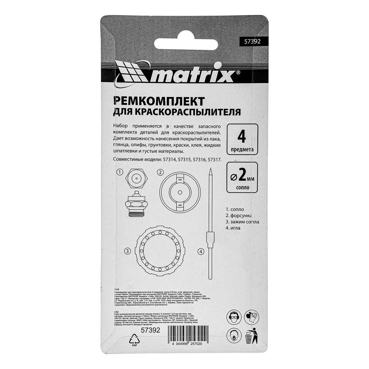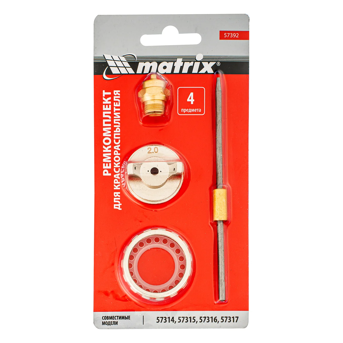 Ремкомплект для краскораспылителя 4 предмета: сопло 2,0 мм, игла, форсунка, зажим сопла Matrix 57392