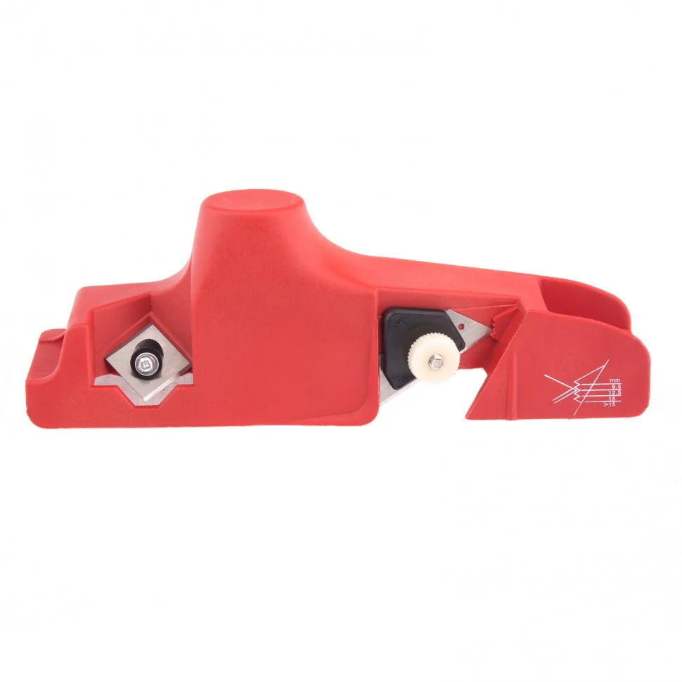 Пластиковый кромочный рубанок для гипсокартона MTX 879055 позволяет обрезать края гипсокартонных листов под углом 22,5 или 45 градусов, для чего на нем установлены 2 ножа. Положение переднего лезвия, снимающего фаску под углом 22,5 градуса, регулируется в зависимости от толщины листа — 9,5, 12,5, 15 мм или более. Инструмент используется при проведении отделочных работ.ПреимуществаКорпус и фиксирующие планки изготовлены из усиленного нейлона, поэтому инструмент прочен и долговечен.Ножи изготовлены из высококачественной инструментальной стали марки 45 и имеют твердость 52-60 HRC, что обеспечивает им высокий ресурс работоспособности.Регулировка лезвия осуществляется при помощи винта, что облегчает работу с рубанком.