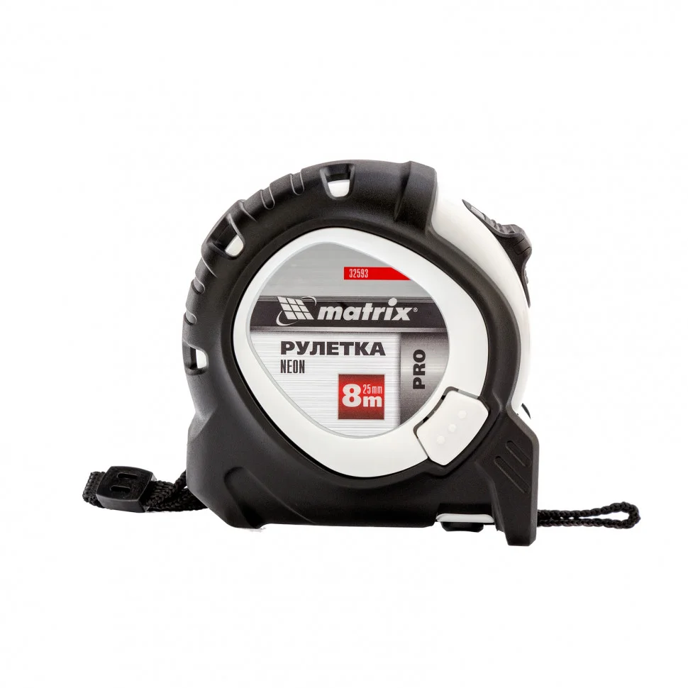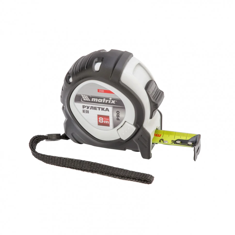 Рулетка Matrix PRO Neon 32593, 8 м х 25 мм, в обрезиненном корпусе, с 3 механизмами фиксации, служит для определения расстояний и размеров различных предметов. Крупные цифры на матовом желто-зеленом полотне хорошо видны, что делает процесс измерения комфортным. Полотно шириной 25 мм с увеличенным вылетом облегчает проведение замеров в труднодоступных местах. Измерительное полотно можно зафиксировать на нужной отметке при помощи стопора или одной из двух кнопок-пауз — это удобно при проведении большого количества замеров. Рулетка предназначена для выполнения профессиональных и бытовых измерительных работ.ПреимуществаКорпус рулетки устойчив к случайным повреждениям, поскольку изготовлен из ударопрочного пластика и обрезинен.Измерения проводятся от ноля благодаря подвижному зацепу.Рулетку можно повесить на запястье, поскольку у нее имеется удобный ремешок.Инструмент можно укрепить на поясе при помощи металлического зажима на корпусе.
