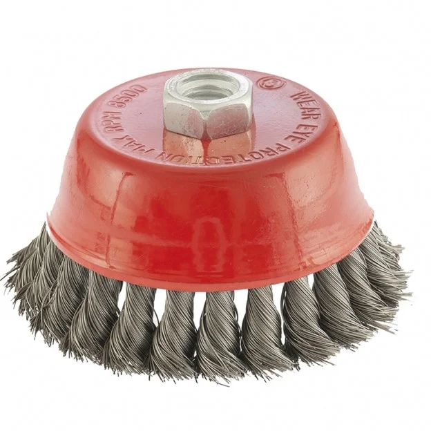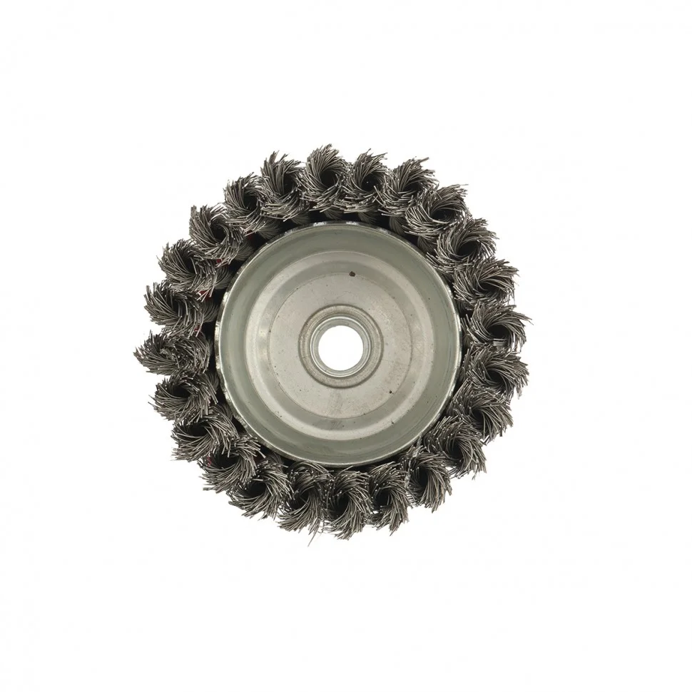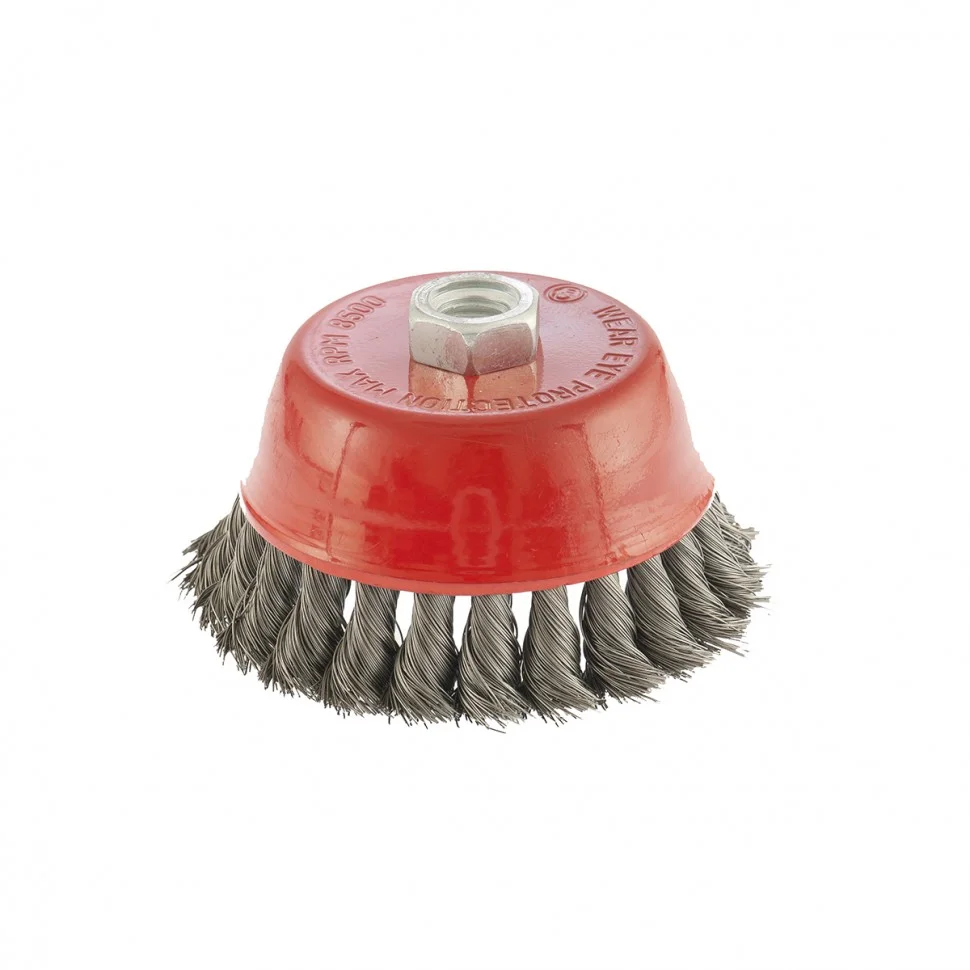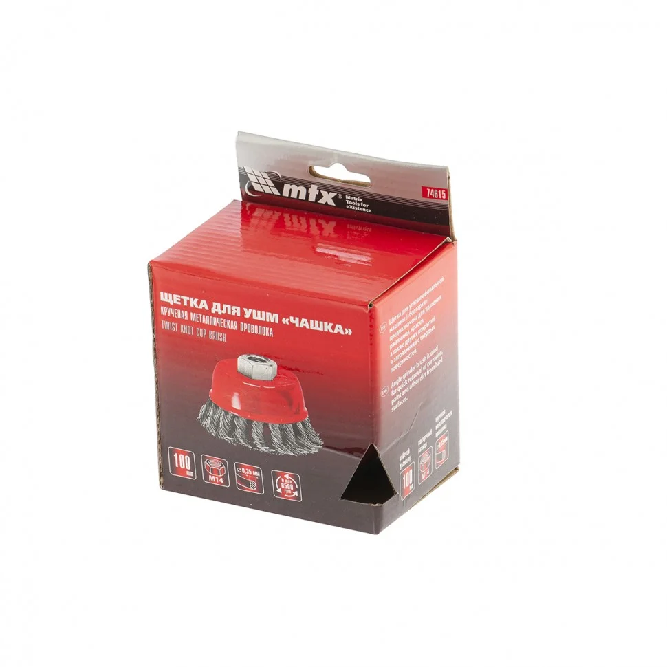 Щетка Matrix «Чашка» 74615 диаметром 100 мм, М14, с крученой проволокой 0,35 мм, применяется в качестве оснастки на УШМ. Щетина рассчитана на грубую (черновую) обработку поверхностей, но менее агрессивную в сравнении с щетиной 0,5 мм. Изделие подходит для удаления загрязнений, снятия толстого слоя ржавчины, ЛКМ, зачистки сварных швов. Рекомендуемая скорость использования — 8500 об/мин.ПреимуществаБлагодаря высококачественной проволоке оснастка прослужит долгое время.Благодаря форме «чашка» насадка имеет большую площадь прилегания, поэтому оптимально подходит для обработки больших поверхностей.Щетку универсального назначения можно использовать для обработки любых твердых материалов: металла, древесины, цветных металлов, пластика и др.Корпус покрыт эмалью, а щетина — маслом, за счет чего щетка устойчива к коррозии.