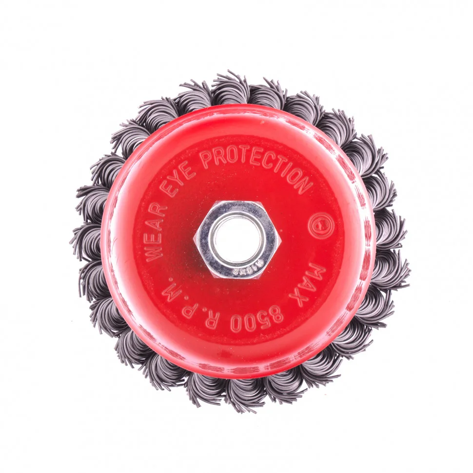 Щетка Matrix «Чашка» 74623 диаметром 100 мм, М14, с крученой проволокой 0,8 мм, применяется в качестве оснастки на УШМ. Щетина рассчитана на грубую (черновую) обработку поверхностей, более агрессивную в сравнении с щетиной 0,5 мм. Изделие подходит для удаления загрязнений, снятия толстого слоя ржавчины, ЛКМ, зачистки сварных швов. Рекомендуемая скорость использования — 8500 об/мин.ПреимуществаБлагодаря высококачественной проволоке оснастка прослужит долгое время.Благодаря форме «чашка» насадка имеет большую площадь прилегания, поэтому оптимально подходит для обработки больших поверхностей.Щетку универсального назначения можно использовать для обработки любых твердых материалов: металла, древесины, цветных металлов, пластика и др.Корпус покрыт эмалью, а щетина — маслом, за счет чего щетка устойчива к коррозии.