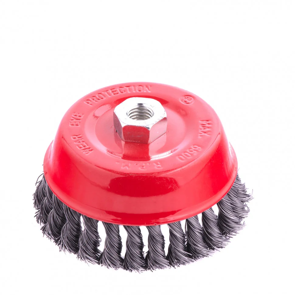 Щетка Matrix «Чашка» 74627 диаметром 125 мм, М14, с крученой проволокой 0,35 мм, применяется в качестве оснастки на УШМ. Щетина рассчитана на грубую (черновую) обработку поверхностей. Изделие подходит для удаления загрязнений, снятия толстого слоя ржавчины, ЛКМ, зачистки сварных швов. Рекомендуемая скорость использования — 6500 об/мин.ПреимуществаБлагодаря высококачественной проволоке оснастка прослужит долгое время.Благодаря форме «чашка» насадка имеет большую площадь прилегания, поэтому оптимально подходит для обработки больших поверхностей.Щетку универсального назначения можно использовать для обработки любых твердых материалов: металла, древесины, цветных металлов, пластика и др.Корпус покрыт эмалью, а щетина — маслом, за счет чего щетка устойчива к коррозии.