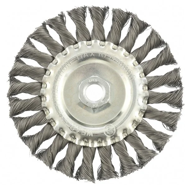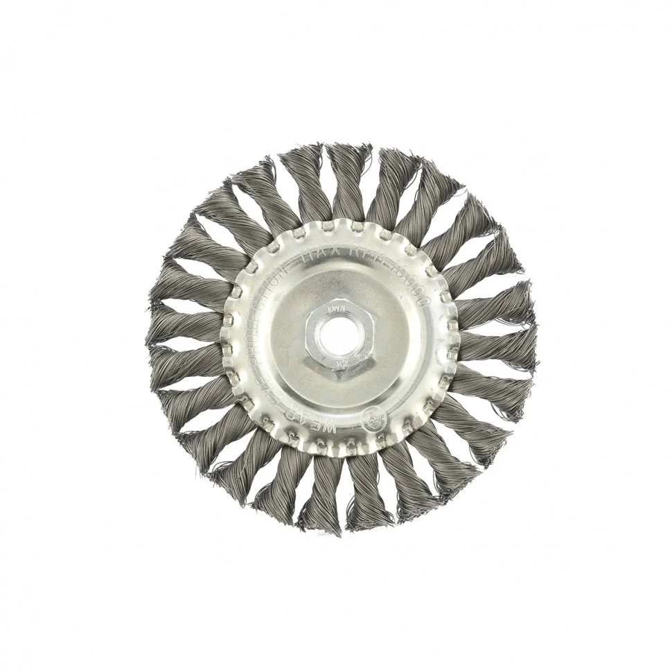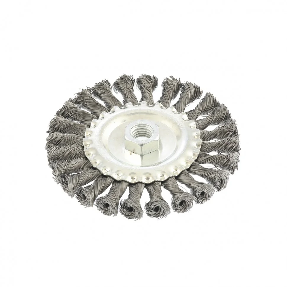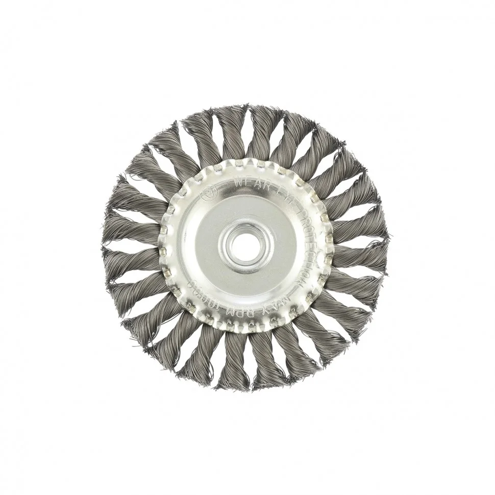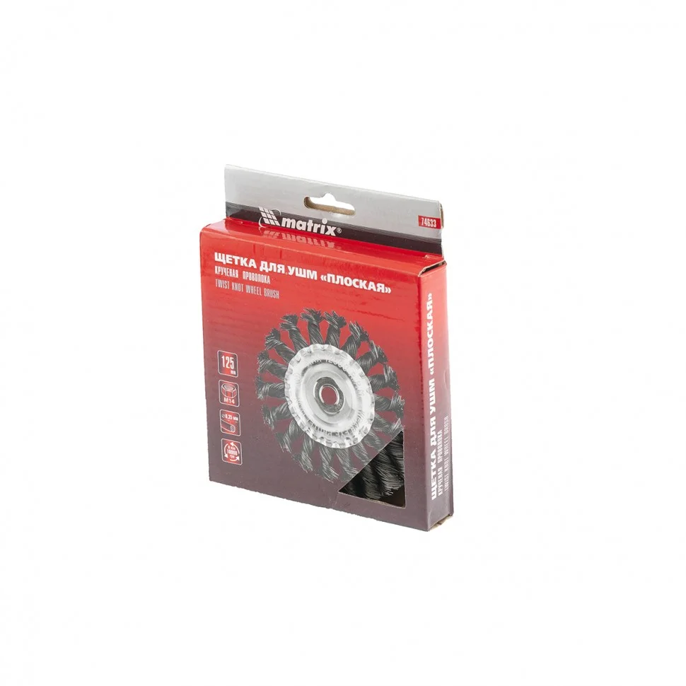 Плоская щетка для УШМ Matrix 74633 диаметром 125 мм, с крученой проволокой 0,35 мм и гайкой М14 используется для грубой (черновой) обработки поверхностей. Она устанавливается в качестве оснастки на УШМ. Благодаря щетке можно снять толстый слой ржавчины, лакокрасочных покрытий, загрязнений, а также зачистить сварные швы. За счет плоской формы ею удобно проводить обработку в труднодоступных местах: углах, изгибах и др. А благодаря щетине 0,35 мм осуществляется менее агрессивная зачистка по сравнению с щетиной 0,5 мм. Эксплуатация щетки допускается на скорости не более 10000 об/мин.ПреимуществаЩетина из прочной стальной проволоки обеспечивает высокий ресурс щетки.Щетка универсальна и может использоваться для обработки различных поверхностей: металлических, в т.ч. из цветных металлов, деревянных, пластиковых.Щетина обработана маслом, а корпус покрыт цинком для повышения антикоррозионных свойств щетки.