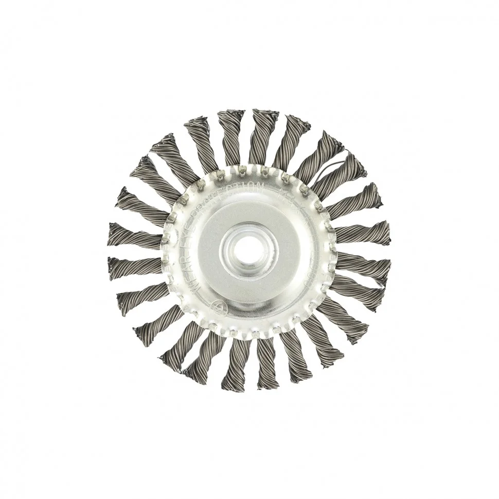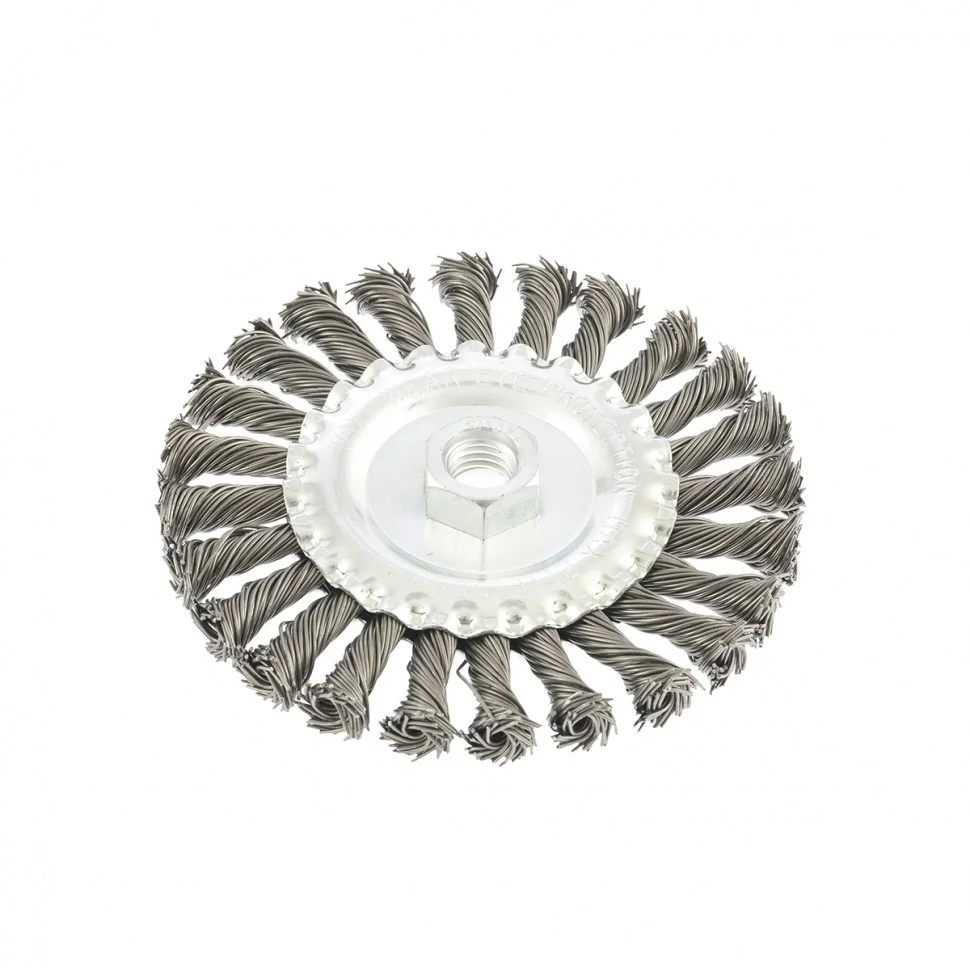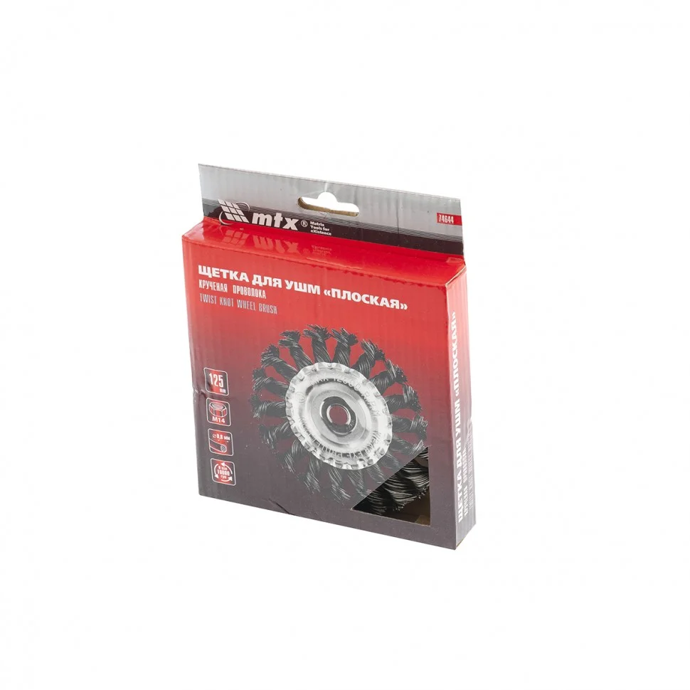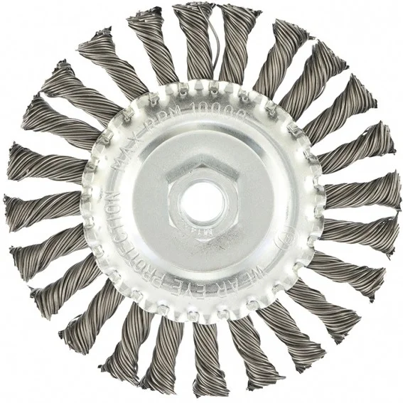 Плоская щетка для УШМ Matrix 74644 диаметром 125 мм, с крученой проволокой 0,8 мм и гайкой М14 используется для грубой (черновой) обработки поверхностей. Она устанавливается в качестве оснастки на УШМ. Благодаря щетке можно снять толстый слой ржавчины, лакокрасочных покрытий, загрязнений, а также зачистить сварные швы. За счет плоской формы ею удобно проводить обработку в труднодоступных местах: углах, изгибах и др. Эксплуатация щетки допускается на скорости не более 10000 об/мин.ПреимуществаЩетина из прочной стальной проволоки обеспечивает высокий ресурс щетки.Щетка универсальна и может использоваться для обработки различных поверхностей: металлических, в т.ч. из цветных металлов, деревянных, пластиковых.Щетина обработана маслом, а корпус покрыт цинком для повышения антикоррозионных свойств щетки.