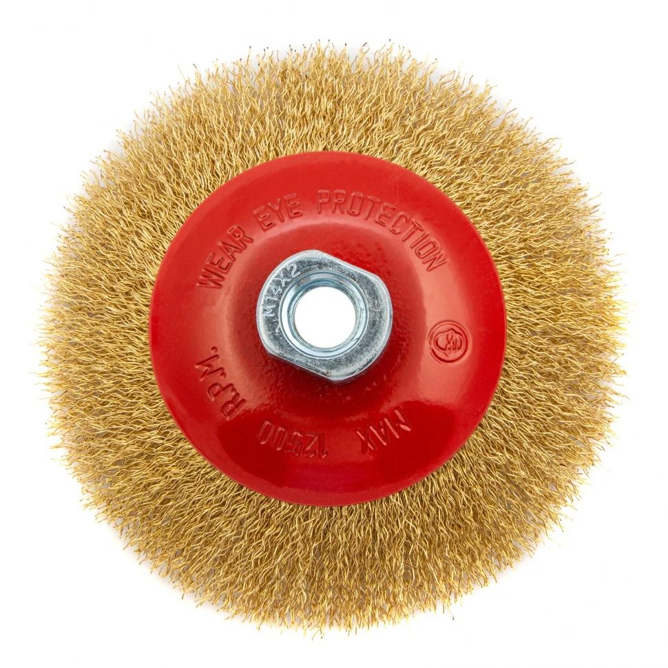 Щетка Matrix «тарелка» 74616 диаметром 125 мм, с витой проволокой, М14, устанавливается на вал УШМ. Витая проволока подходит для щадящей обработки поверхностей, снятия тонкого слоя ржавчины, лакокрасочных покрытий и загрязнений. Универсальная форма «тарелка» позволяет использовать щетку для зачистки углов и плоскостей. Рекомендуемая скорость использования — 12500 об/мин.ПреимуществаВысокий ресурс — щетина выполнена из стальной проволоки высокого качества.Универсальное назначение — можно обрабатывать любые твердые материалы: металл, древесину, цветные металлы, пластик и т.д.Коррозионная стойкость — латунированная щетина и корпус покрытый эмалью не боятся ржавчины, что позволяет использовать изделие вне помещений.