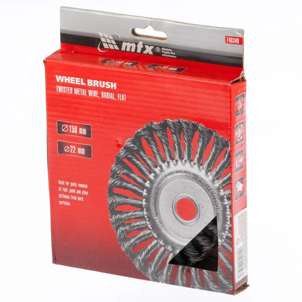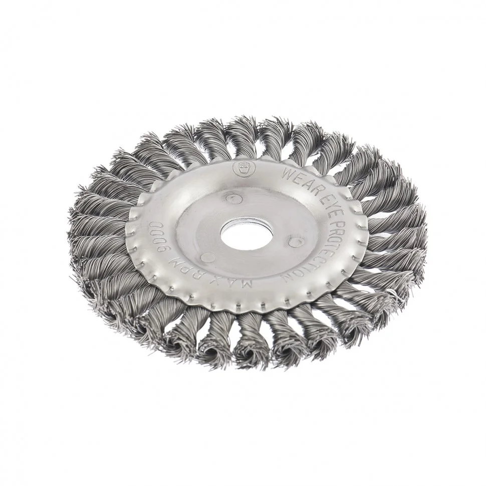 Плоская щетка Matrix 74634 диаметром 150 мм и посадкой 22,2 мм, с крученой проволокой 0,5 мм, устанавливается на вал УШМ. Щетина с крученой проволокой эффективно удаляет толстый слой ржавчины, лакокрасочных материалов и загрязнения с поверхностей при проведении грубой (черновой) обработки. Плоская форма позволяет обрабатывать труднодоступные места, в т.ч. углы и изгибы. Рекомендуется использовать щетку на оборотах не более 9000 об/мин.ПреимуществаЗа счет высококачественной нержавеющей проволоки обеспечивается долговечность щетины.Универсальная щетка рассчитана на обработку твердых поверхностей из любых материалов: металла, древесины, цветных металлов, пластика и т.д.Щетку можно использовать вне помещений, т.к. щетина покрыта маслом, а корпус оцинкован.