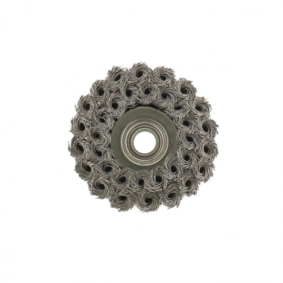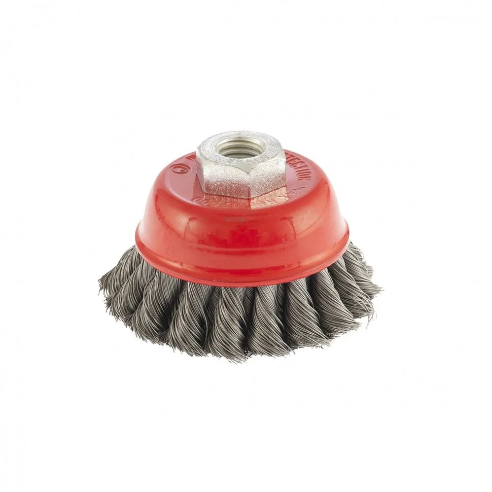 Двухрядная щетка Matrix «Чашка» 74676 диаметром 75 мм, с крученой проволокой 0,35 мм, устанавливается на вал углошлифовальной машины с помощью гайки М14. Оптимально подходит для грубой (черновой) обработки: снятия старого слоя ЛКП, ржавчины и удаления загрязнений, зачистки сварных швов. За счет двух рядов проволоки щетка справляется с зачисткой больших поверхностей и работой повышенной сложности. Рекомендованная максимальная скорость работы — до 12500 об/мин.ПреимуществаСтальная крученая проволока — оснастка отличается прочностью и долговечностью.Универсальное применение — щеткой можно обрабатывать любые твердые материалы: металл, древесину, цветные металлы, пластик и т.д.Высокая производительность — двухрядная щетка за один проход снимает большое количество материала, не снижая качество работы.Толщина щетины 0,35 мм — щетка очищает поверхности менее агрессивно, чем изделия с щетиной 0,5 мм.Защита от коррозии — корпус оцинкован, щетина покрыта техническим маслом.