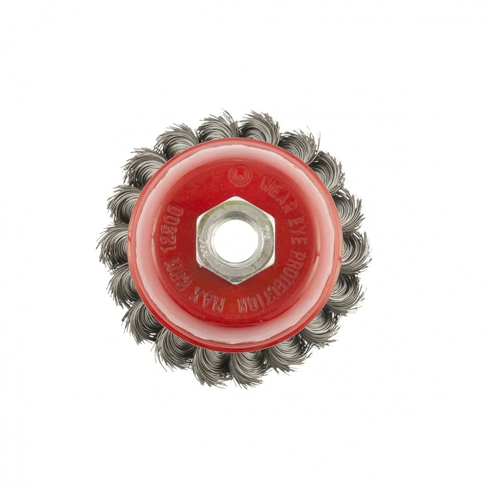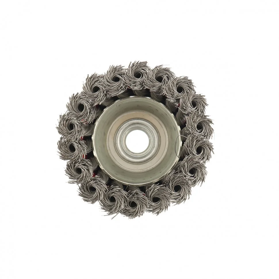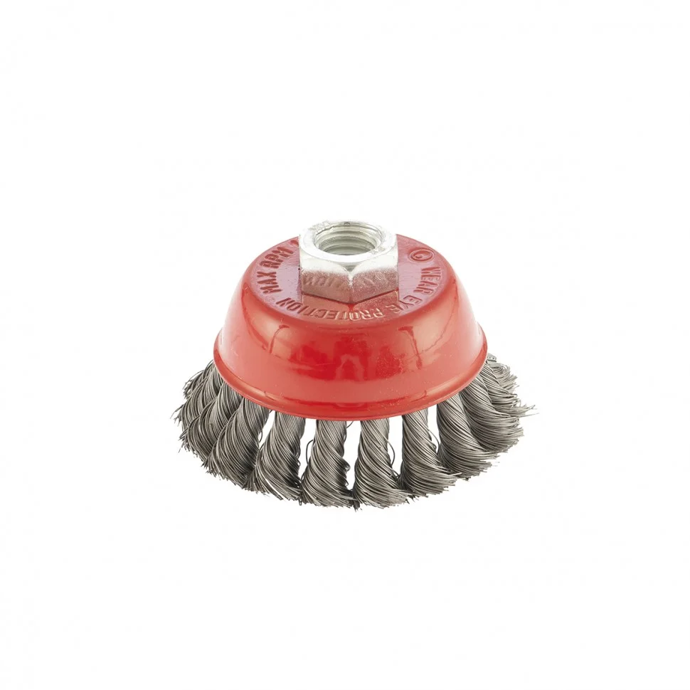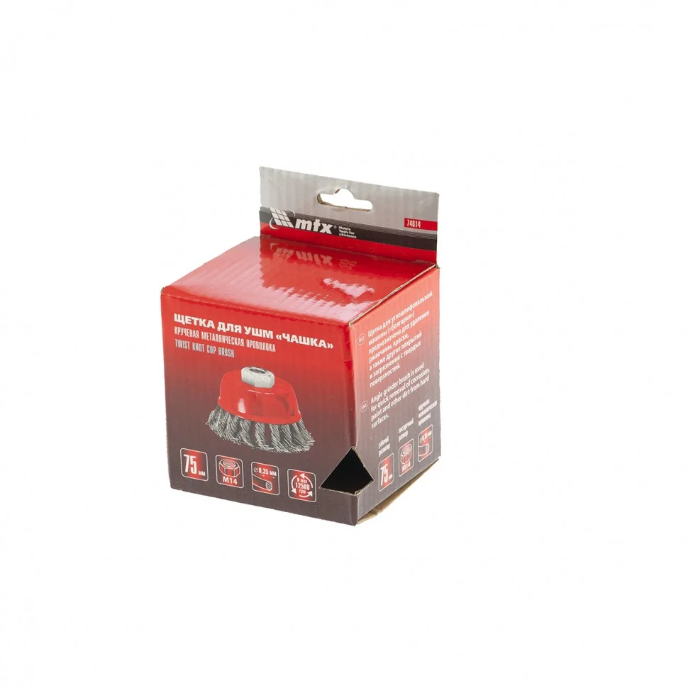 Щетка Matrix «Чашка» 74614 диаметром 75 мм, М14, с крученой проволокой 0,35 мм, применяется в качестве оснастки на УШМ. Щетина рассчитана на грубую (черновую) обработку поверхностей, но менее агрессивную в сравнении с щетиной 0,5 мм. Изделие подходит для удаления загрязнений, снятия толстого слоя ржавчины, ЛКМ, зачистки сварных швов. Рекомендуемая скорость использования — 12500 об/мин.ПреимуществаБлагодаря высококачественной проволоке оснастка прослужит долгое время.Благодаря форме «чашка» насадка имеет большую площадь прилегания, поэтому оптимально подходит для обработки больших поверхностей.Щетку универсального назначения можно использовать для обработки любых твердых материалов: металла, древесины, цветных металлов, пластика и др.Корпус покрыт эмалью, а щетина — маслом, за счет чего щетка устойчива к коррозии.