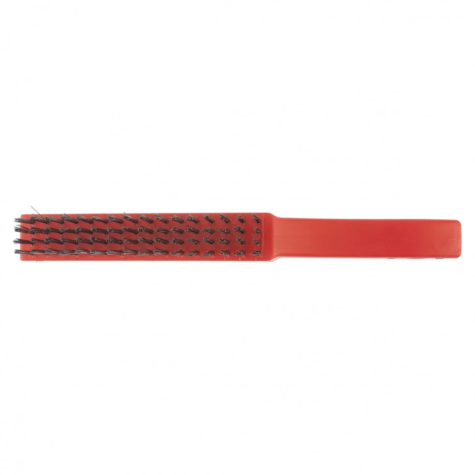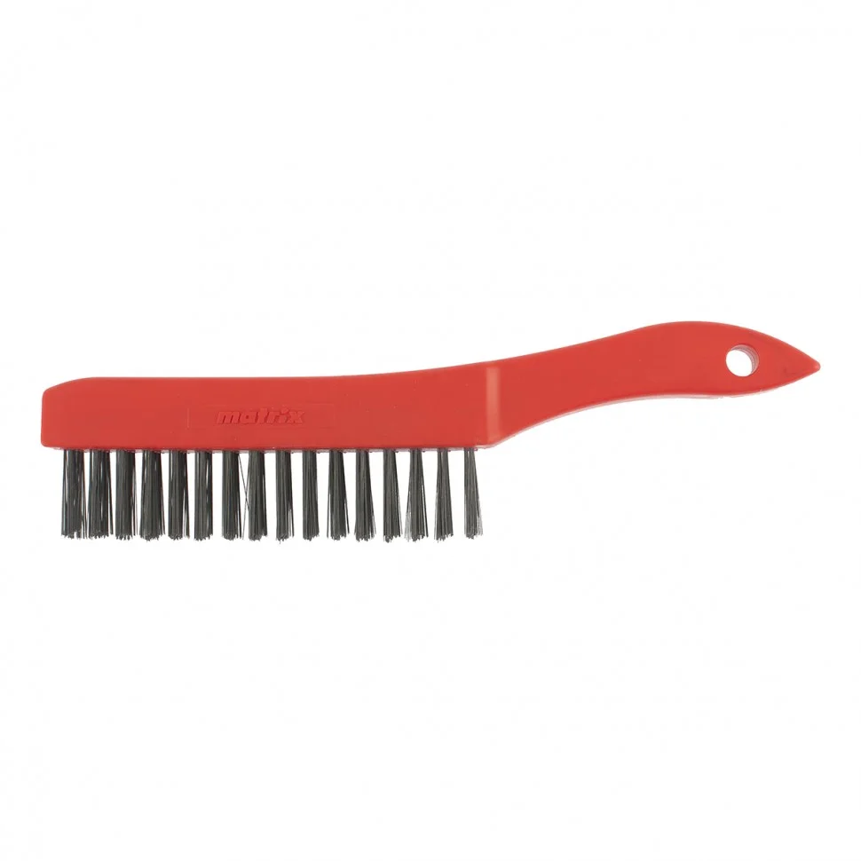 Зачистная 4-рядная щетка Matrix 74814 с пластиковой ручкой и щетиной из закаленной прямой проволоки используется для удаления загрязнений, ржавчины, остатков лакокрасочных покрытий с металлических, деревянных, бетонных поверхностей. Пучки расположены в 4 ряда, в каждом пучке 20 щетинок, поэтому щетка выдерживает повышенные нагрузки и обеспечивает качественную обработку. Рукоятка изогнута для повышения комфортности использования. Щетка пригодится во время строительных и ремонтных работ, а также будет полезна дома или в гараже.ПреимуществаЩетина прочна и устойчива к износу, т.к. выполнена из закаленной высокоуглеродистой стали.Проволока защищена масляной пленкой, что увеличивает срок службы щетки.Пучки надежно закреплены в основании, поэтому проволока не выпадает во время работы.Рукоятка из прочного пластика не подвержена коррозии и рассыханию, поэтому щетка рассчитана на длительное применение.Отверстие в рукоятке позволяет организовать подвесное хранение инструмента.