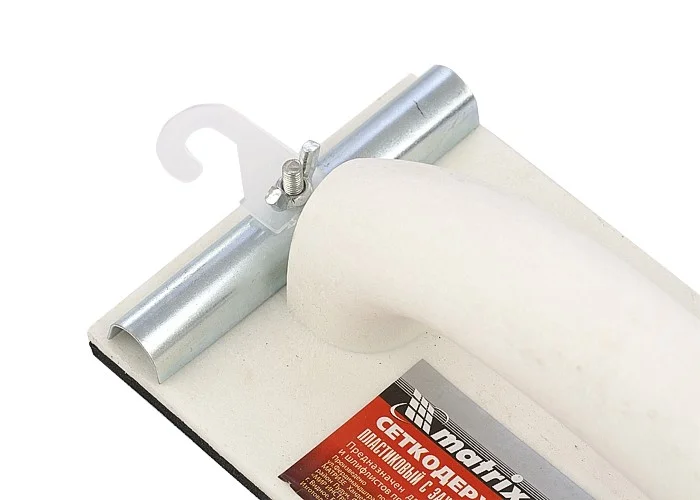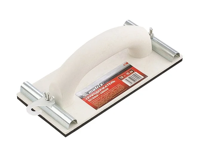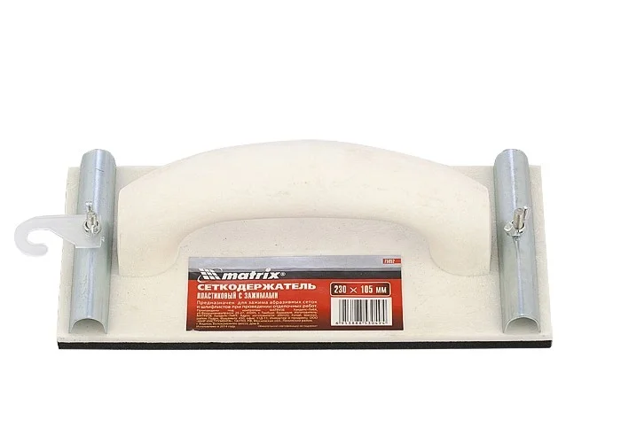 Сеткодержатель Matrix 75852, 230 х 105 мм, пластиковый с зажимами, используется для ручного шлифования деревянных, шпатлеванных, металлических, пластмассовых и прочих твердых поверхностей. Сеткодержатель фиксирует абразивную стеклосетку или шлифлист и позволяет удалять старые отделочные покрытия, подготавливать поверхность под покраску, а также выполнять чистовую обработку.ПреимуществаУдобная ручка обеспечивает надежный хват и делает работу с инструментом комфортной.Винтовые зажимы крепко удерживают абразивный материал, и он не смещается во время работы.Подошва изготовлена из вспененного каучука EVA, отлично держит форму, не боится перепада температур и устойчива к износу.Корпус выполнен из прочного полипропилена, благодаря чему сеткодержатель не боится небольших ударов и падений, а потому прослужит долго.