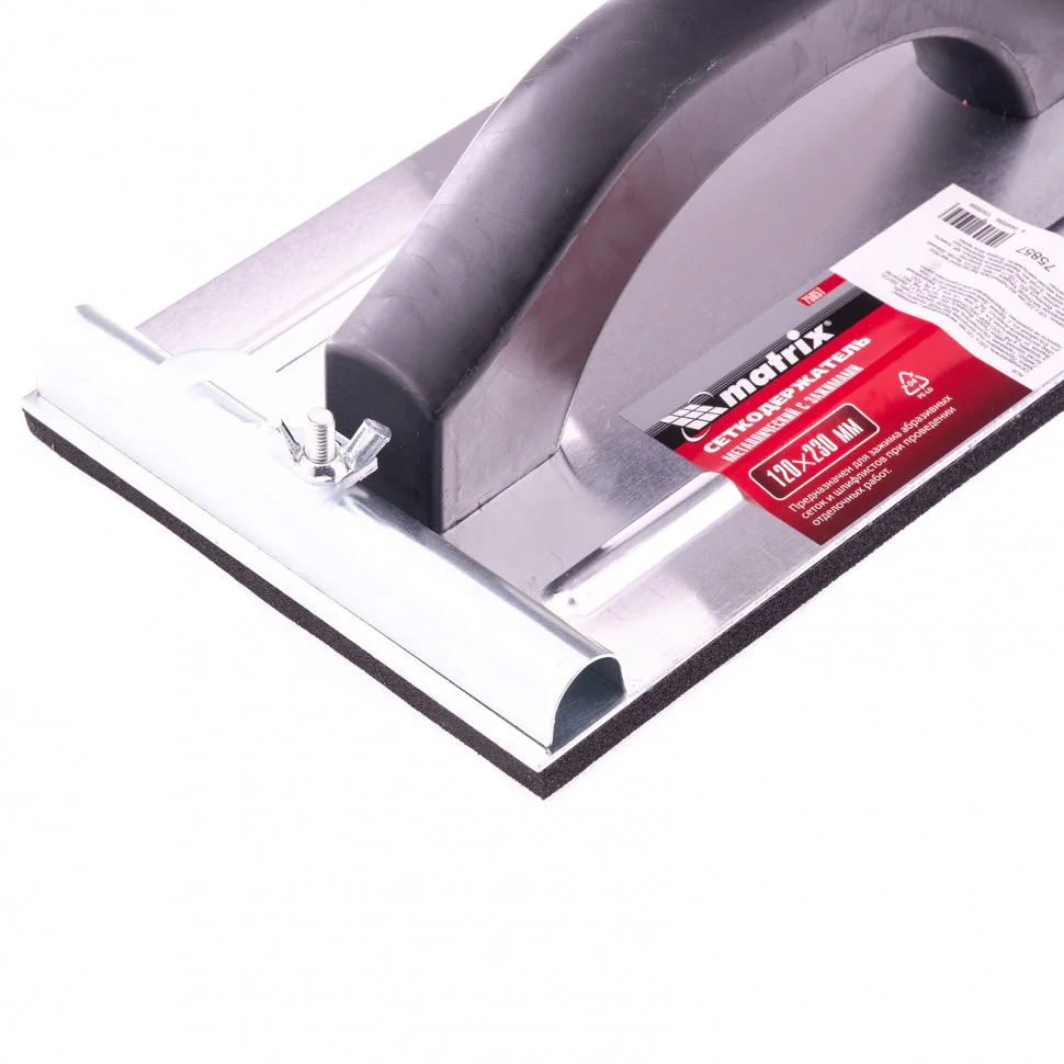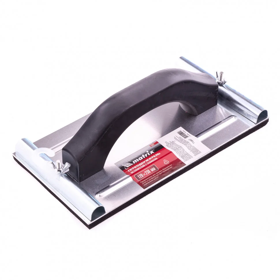 Сеткодержатель Matrix 75857, 230 х 120 мм, металлический с зажимами, используется для ручного шлифования деревянных, шпатлеванных, металлических, пластмассовых и прочих твердых поверхностей. Сеткодержатель фиксирует абразивную стеклосетку или шлифлист и позволяет удалять старые отделочные покрытия, подготавливать поверхность под покраску, а также выполнять чистовую обработку.ПреимуществаУдобная ручка обеспечивает надежный хват и делает работу с инструментом комфортной.Винтовые зажимы крепко удерживают абразивный материал, и он не смещается во время работы.Подошва изготовлена из вспененного каучука EVA, отлично держит форму, не боится перепада температур и устойчива к износу.Корпус выполнен из алюминиевого сплава, благодаря чему сеткодержатель не боится небольших ударов и падений, а потому прослужит долго.