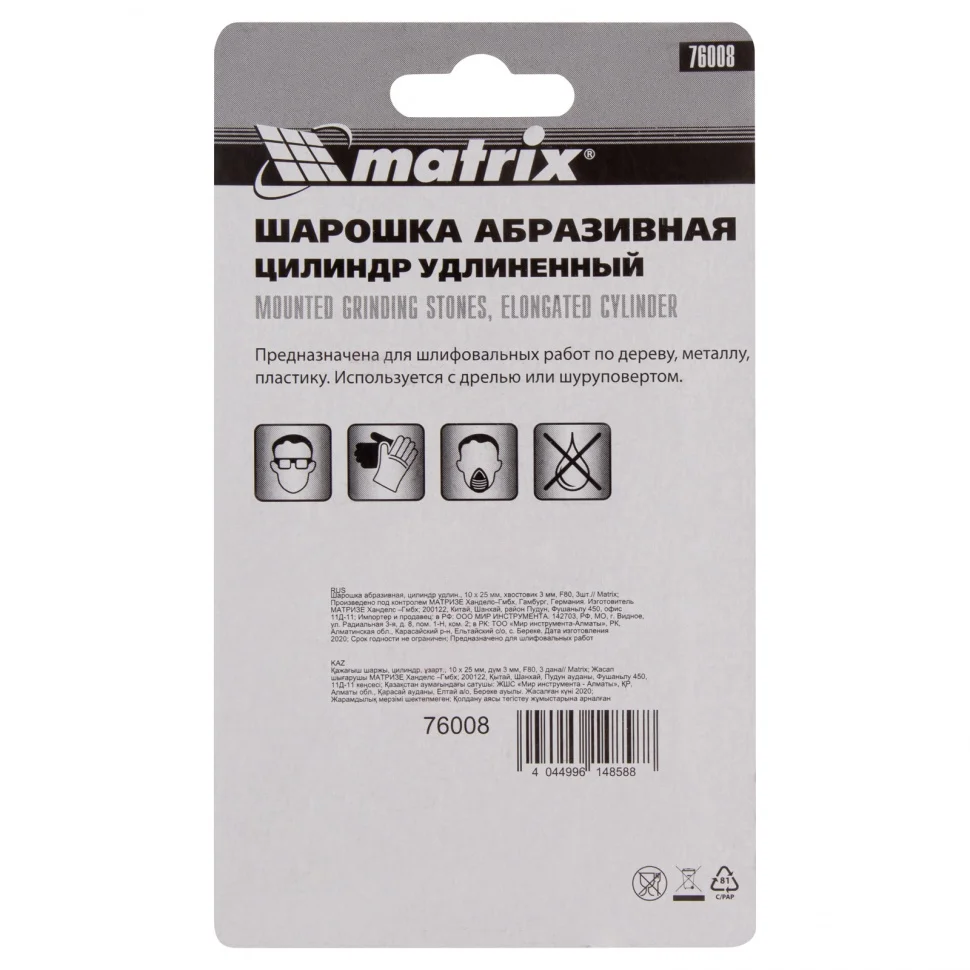Шарошка абразивная Matrix 76008, 10 х 25 мм, с хвостовиком диаметром 3 мм, 3шт., имеет форму удлиненного цилиндра и покрыта среднезернистым абразивом F80. Предназначена для очистки прямолинейных поверхностей, расширения отверстий, снятия фасок и удаления заусенцев. Она используется в качестве оснастки на дрелях, шуруповертах, а также ПШМ при выполнении отделочных и декоративных работ.ПреимуществаАбразив из оксида алюминия универсален по своему применению, поэтому подходит для обработки различных поверхностей: металла, пластика, древесины, минеральных материалов.Среднезернистый абразив F80 позволяет осуществить чистовую шлифовку заготовок.Комплект состоит из 3 шарошек, которых хватит на большой объем работ.