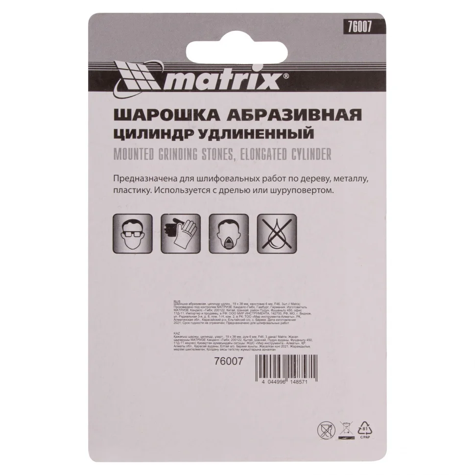 Шарошка абразивная Matrix 76007, 19 х 38 мм, с хвостовиком диаметром 6 мм, 3шт., имеет форму удлиненного цилиндра и покрыта крупнозернистым абразивом F46. Предназначена для очистки прямолинейных поверхностей, расширения отверстий, снятия фасок и удаления заусенцев. Она используется в качестве оснастки на дрелях, шуруповертах, а также ПШМ при выполнении отделочных и декоративных работ.ПреимуществаАбразив из оксида алюминия универсален по своему применению, поэтому подходит для обработки различных поверхностей: металла, пластика, древесины, минеральных материалов.Крупнозернистый абразив F46 позволяет осуществить грубую шлифовку заготовок.Комплект состоит из 3 шарошек, которых хватит на большой объем работ.